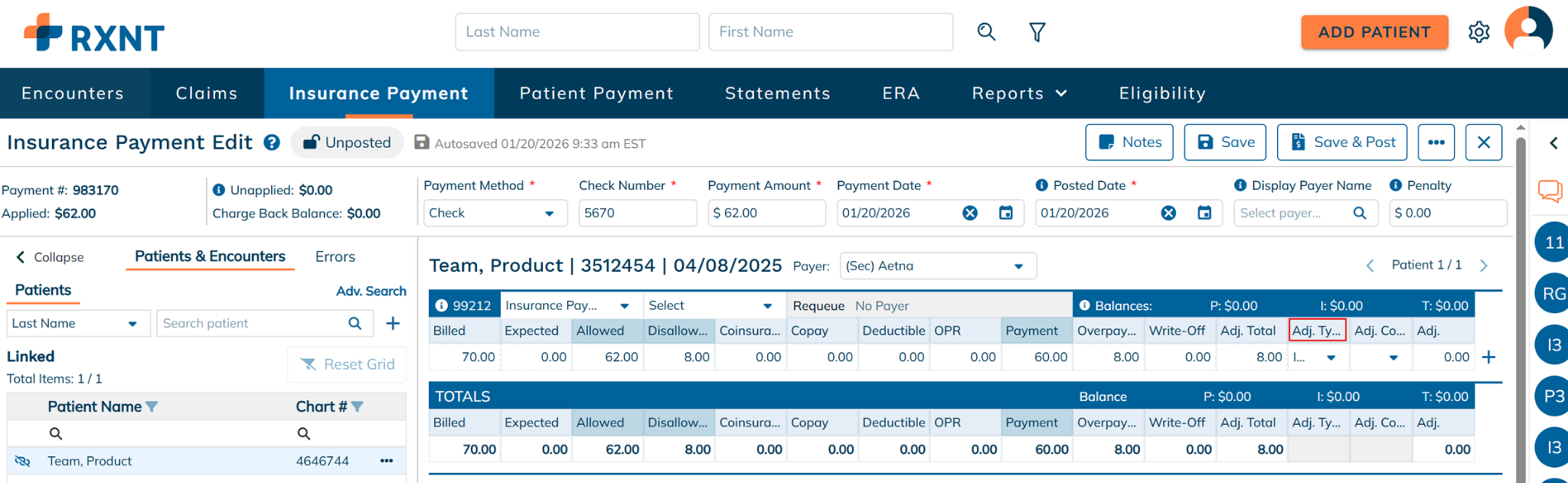 Choose the Adjustment Type from the dropdown menu, which includes Insurance or Patient.