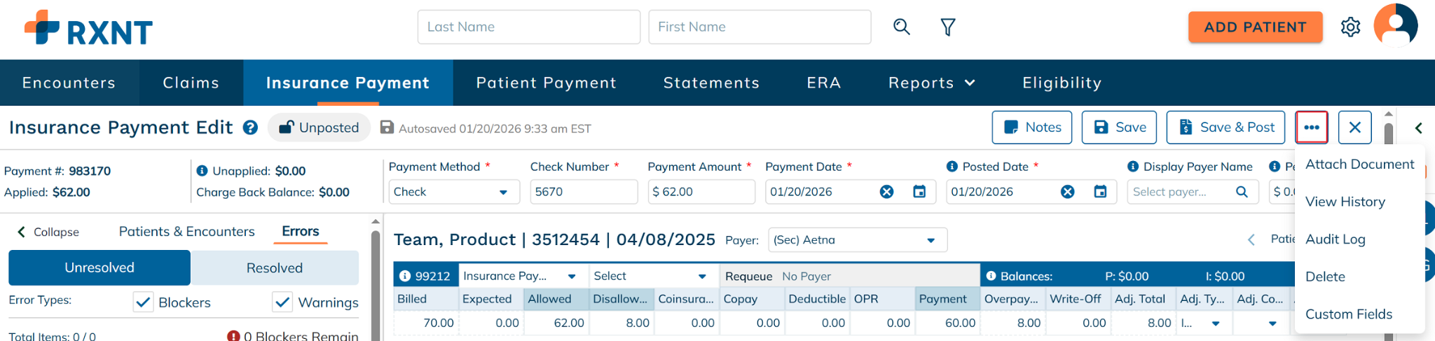 The ERA is processed with all validations automatically populated within the payment. In the Errors tab, there are two views: Unresolved and Resolved. By default, the Unresolved view is displayed and shows errors that still require action. The Resolved view lists errors that have already been addressed. To quickly post ERA payments, navigate directly to the Errors tab, resolve any blockers, and then proceed with posting the payment.