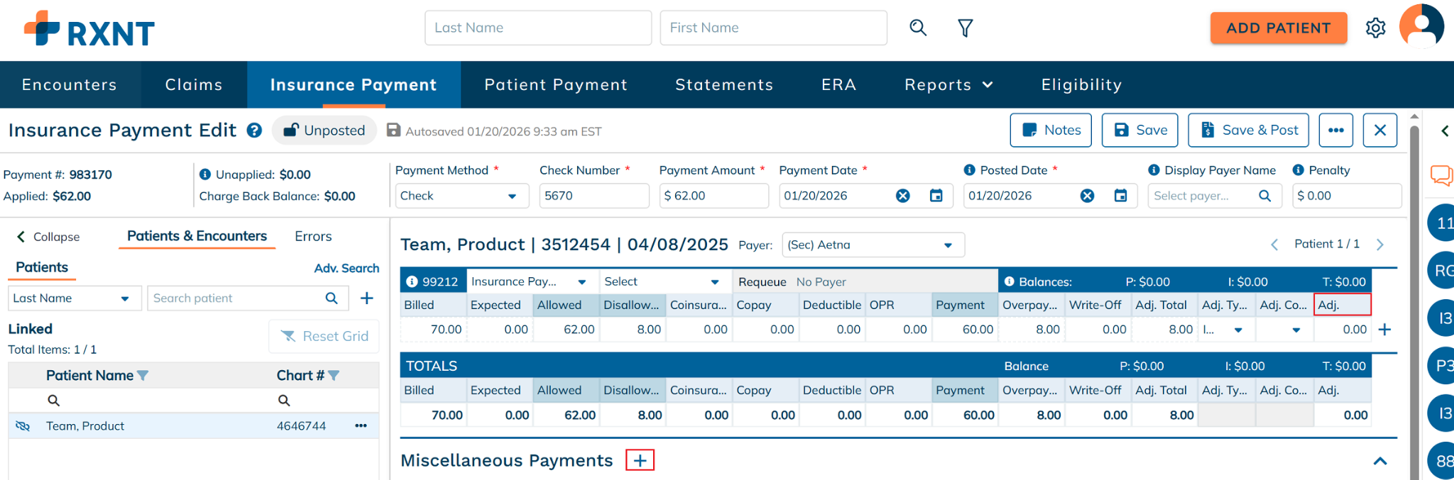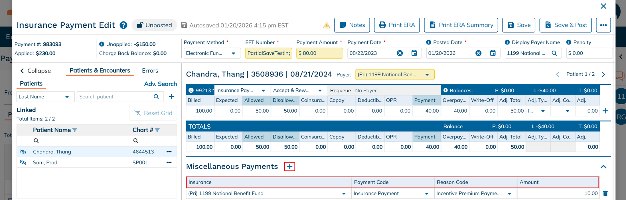 Miscellaneous codes are usually populated from the ERA’s PLB. If not, click the “+” icon to add a miscellaneous payment. Select Insurance from the dropdown to see payers for the patient’s encounter, then choose a Payment Code and a Reason Code from the available options. Enter the payment amount in the Amount field.