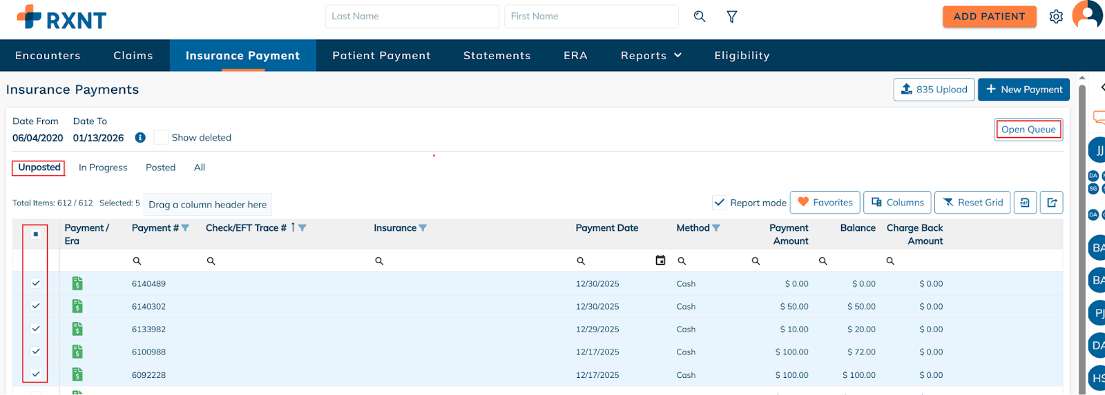 In the Unposted Tab, you can select multiple payments and review them one by one using a queue. To do this, check the box next to each payment you want to include, then click Open Queue.