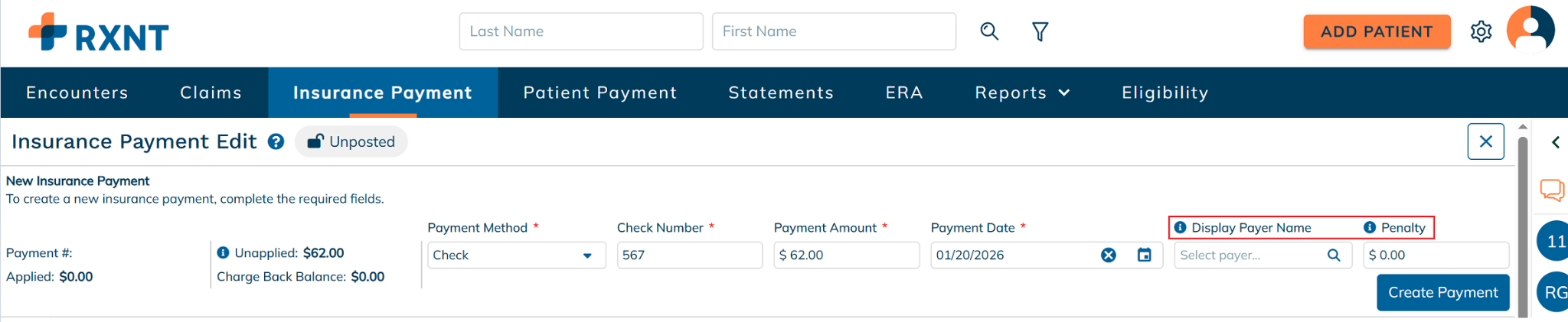 Adding a Payer and Penalty amount is optional and is usually done when you need to document reductions such as late filing penalties, authorization-related penalties, or other payer-imposed deductions. The Payer selected here is used for reporting and display purposes. Users can select a payer for each encounter on the next screen.