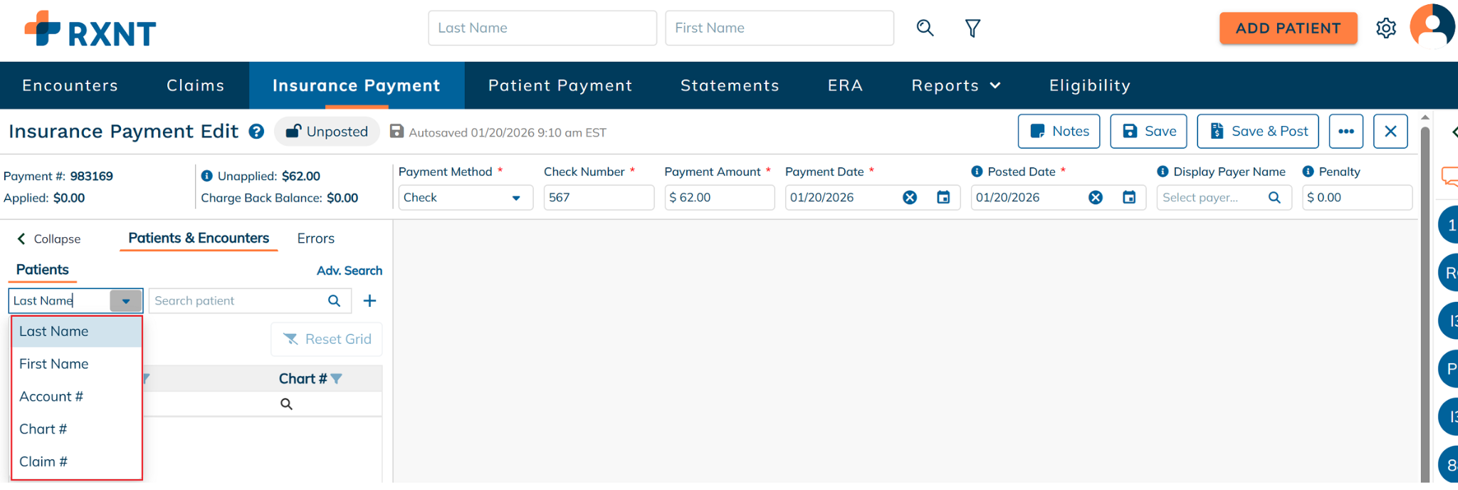 To begin, search for the patient using Last Name, First Name, Account Number, Chart Number, or Claim Number.