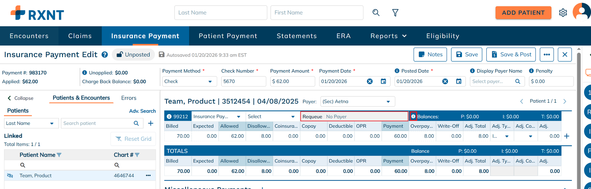 In the Requeue section, the information regarding the next responsible payer will be displayed. If the next payer in responsibility is the patient, the Requeue field will display "No Payer.” Additionally, when any one of the line item statuses is chosen, the Requeue field will display "No Payer.” Based on this logic, the Patient Balance and Insurance Balance will be displayed. Hovering over the information (i) icon will show the total of all past patient and insurance payments.