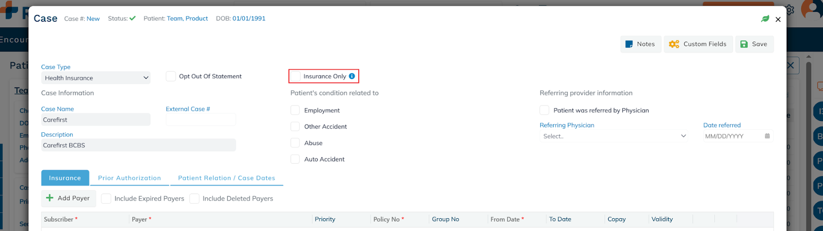 When Insurance Only is selected in a patient’s case, the system automatically writes off the patient balance once responsibility transfers to the patient. Click here to Learn more about patient cases! This write-off is reflected in the Adj. Code column. However, if the line item status is set to Accept & Rework Denial or No Requeue, the insurance-only adjustment can be edited or removed without requiring an update to the patient case.