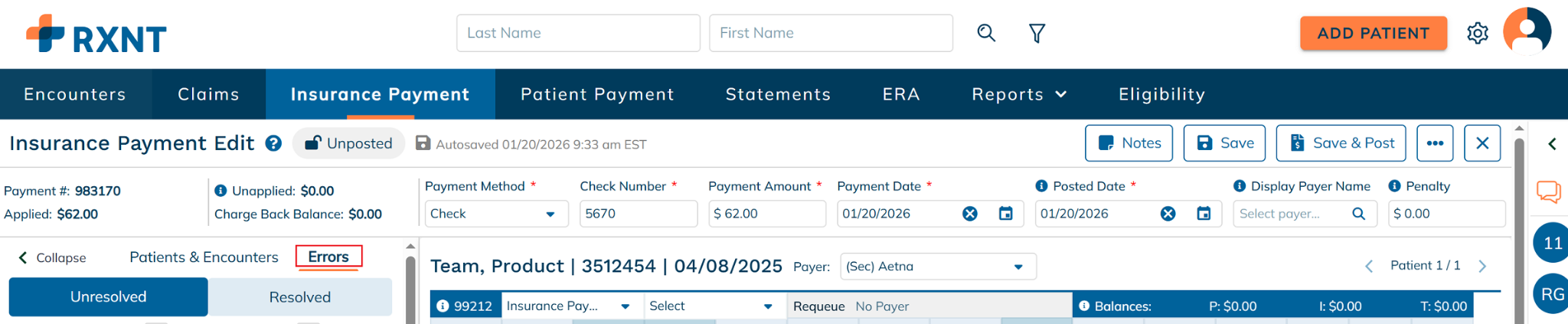 Click the Errors tab to verify if any corrections are required before the payment can be posted. Clicking on the error will navigate you to the exact error. Once resolved, the error will move to the Resolved tab.
