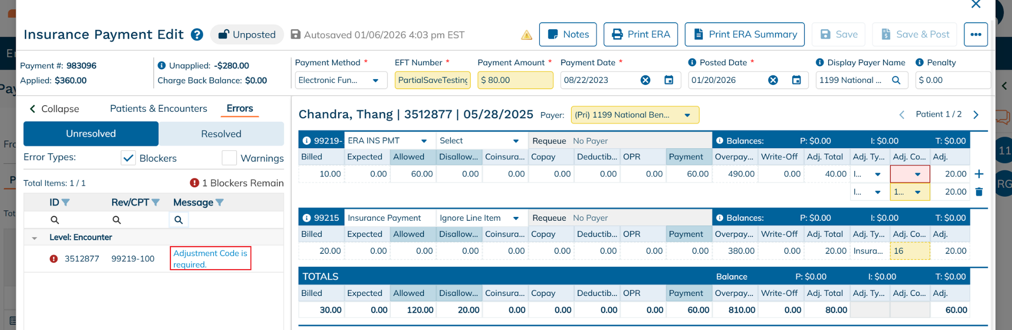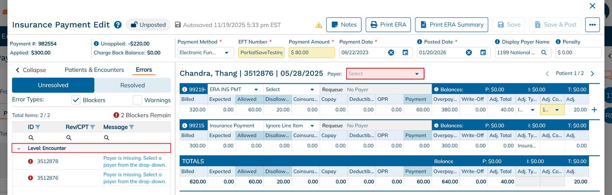 A special blocker error occurs when the ERA payment is received at the encounter level. Such an error is displayed within the error banner and will be resolved once the blocker has been addressed.