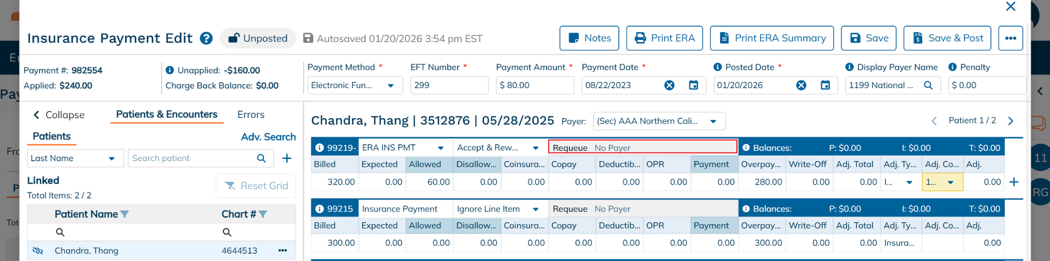 Select the Payer. This payer drop-down is populated from the selected encounter’s case. The line item balances and Requeue payer are assigned correctly based on the chosen payer.
