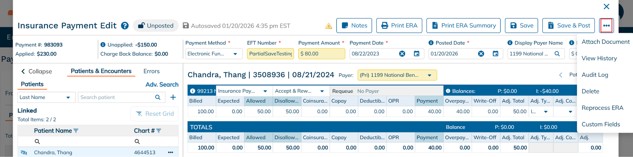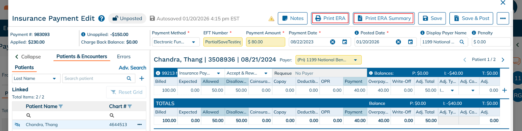 ERA (Electronic Remittance Advice) payments can be reviewed and posted from the unposted insurance payments, but they can also be posted directly from the pending ERAs. These electronic remittances help practices and billing teams process payments more efficiently, reduce errors compared to paper explanations of benefits, and provide a clear, auditable record of all insurance transactions.