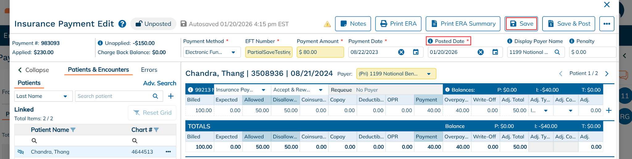 - Unposted payments that are saved or draft-saved will not appear in reports as posted payments, and their posted dates will not display in the grids.