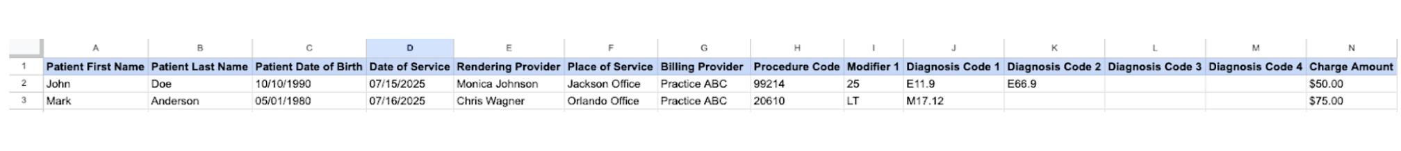 - Case information on the file will be ignored, meaning we will not create new patient cases or associate provided case information to uploaded charges (no case creation or linking).