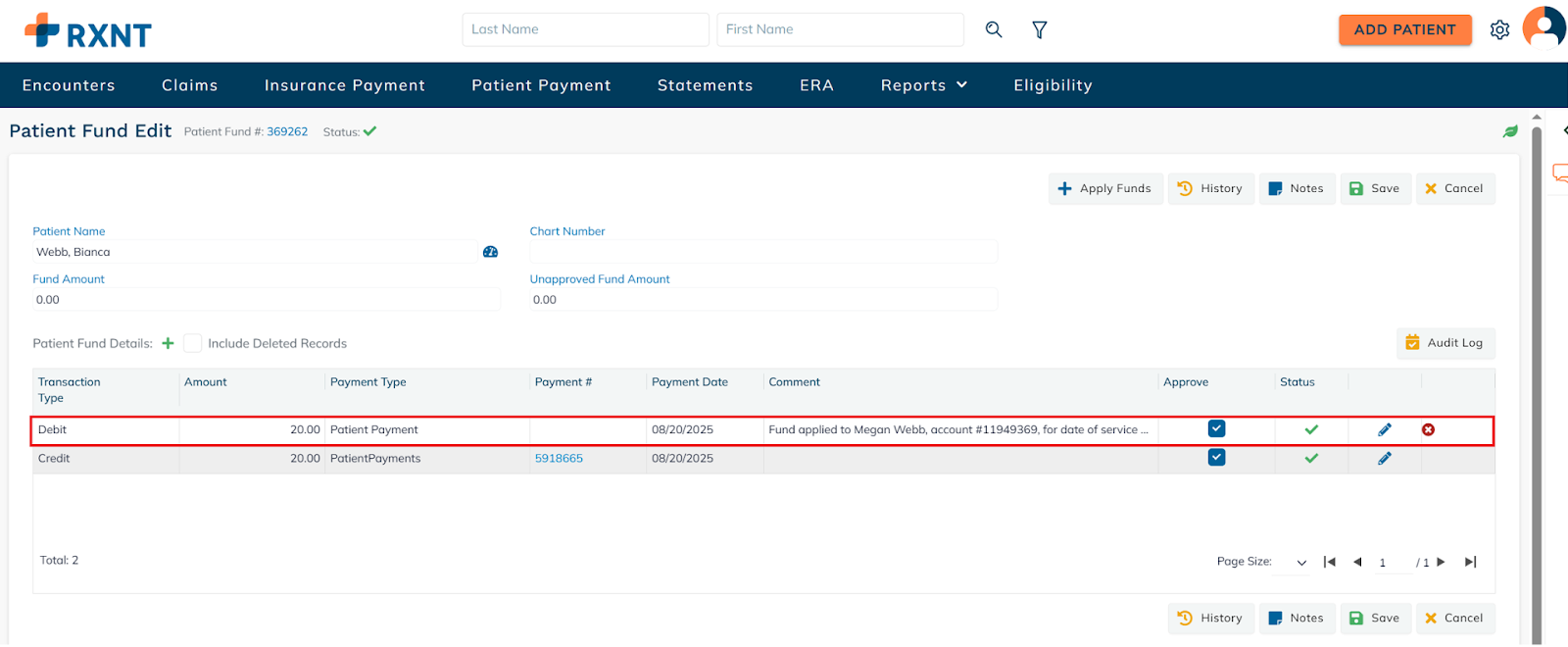 If the funds are being transferred to another patient’s account, you can debit the fund amount and add a note indicating it was credited to the other patient’s account, then manually create the fund for that patient.