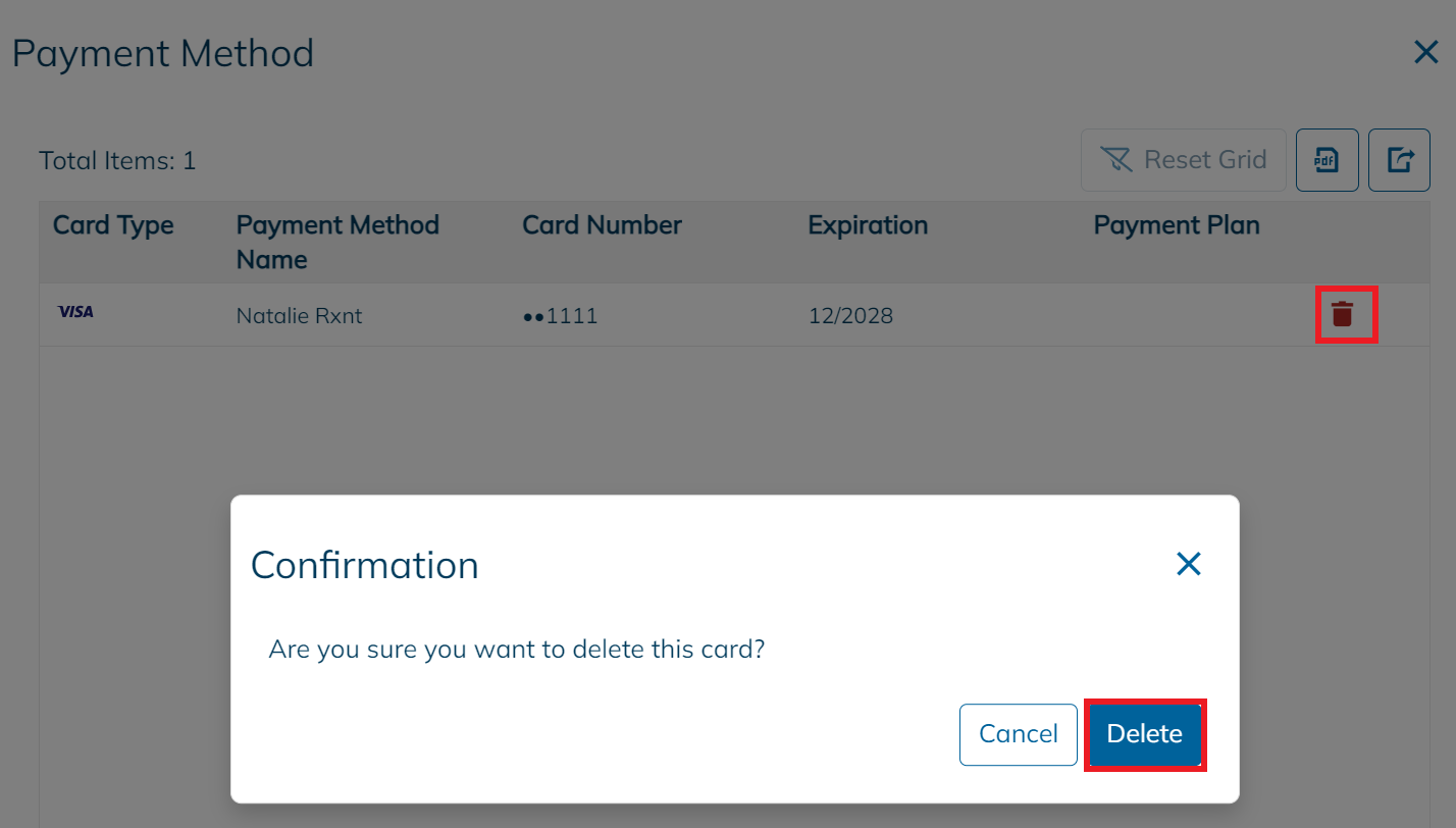 To remove a patient credit card, simply click on the Red Trashcan icon and then select Delete.