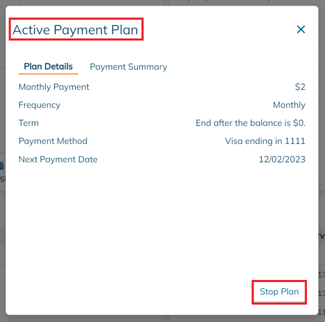 To access details about active payment plans or to stop payment plans, simply click on View Plan.