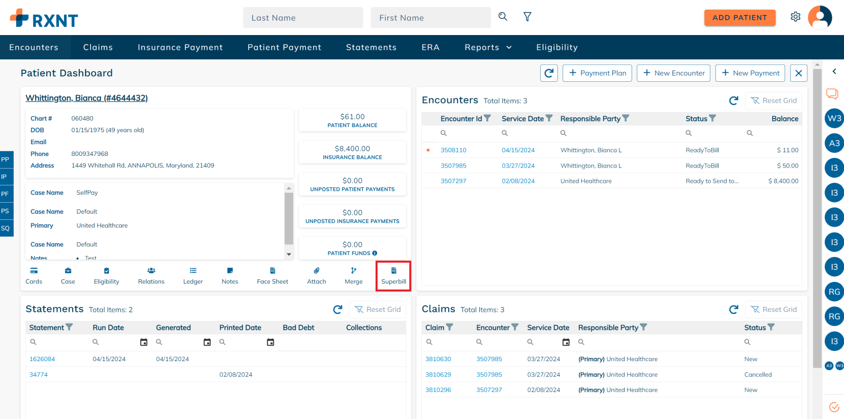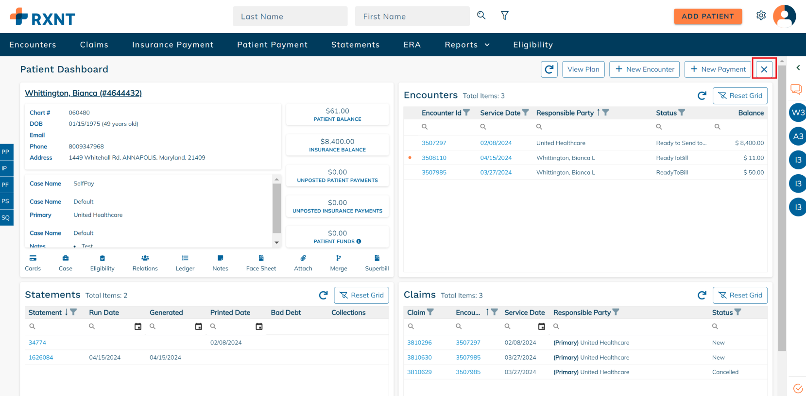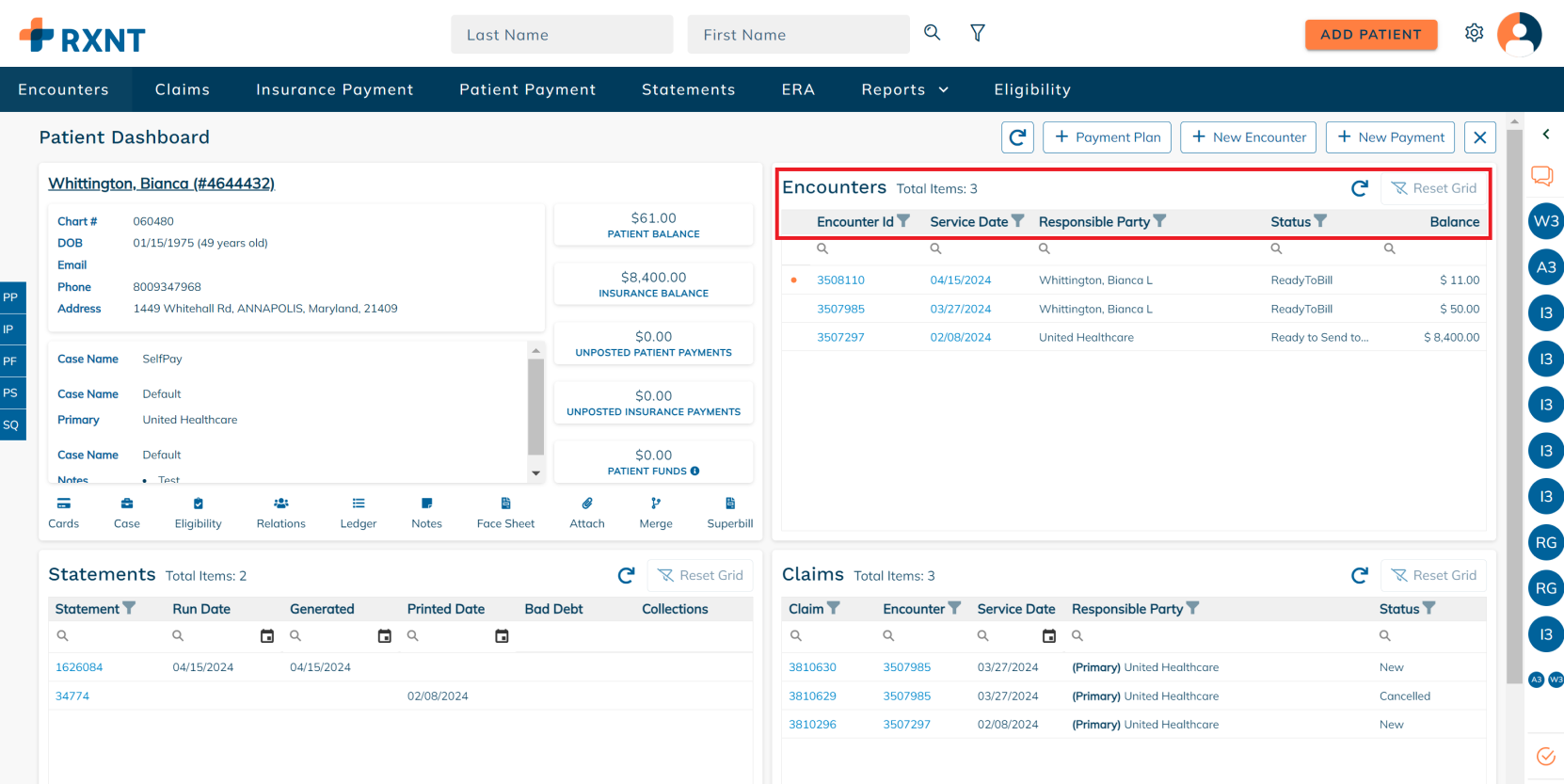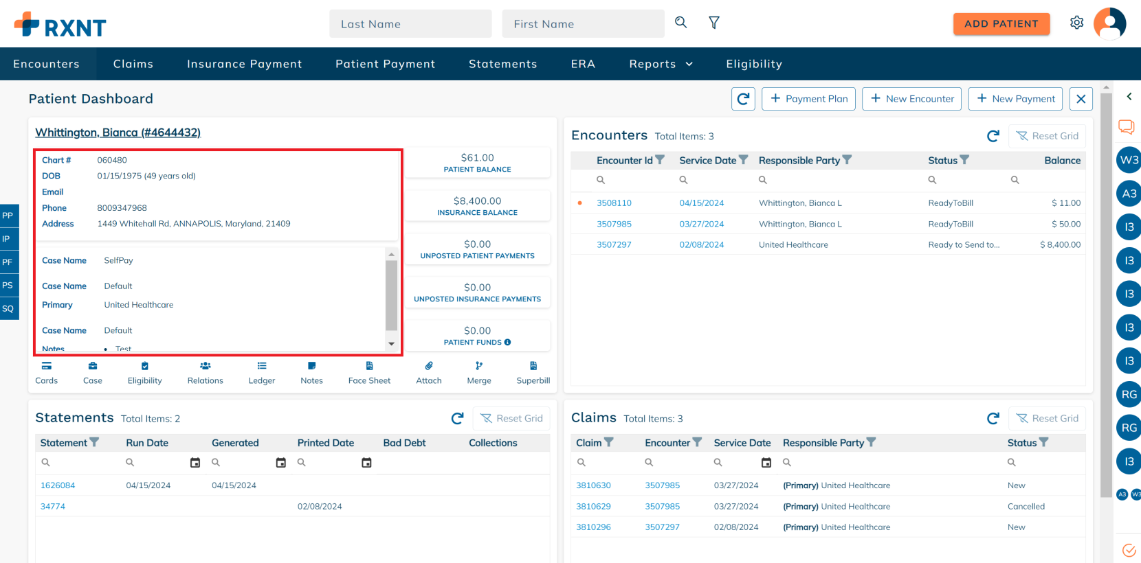 The patient dashboard provides everything you need when working on a patient account. You will see data about your patient's demogra[hics, encounters, statements, claims, and more!