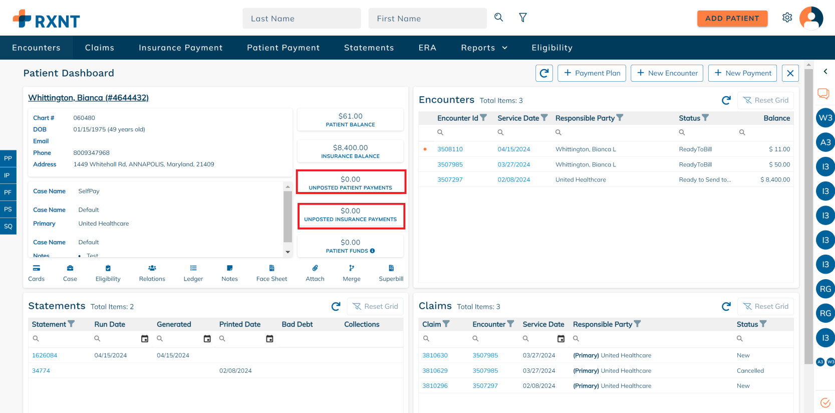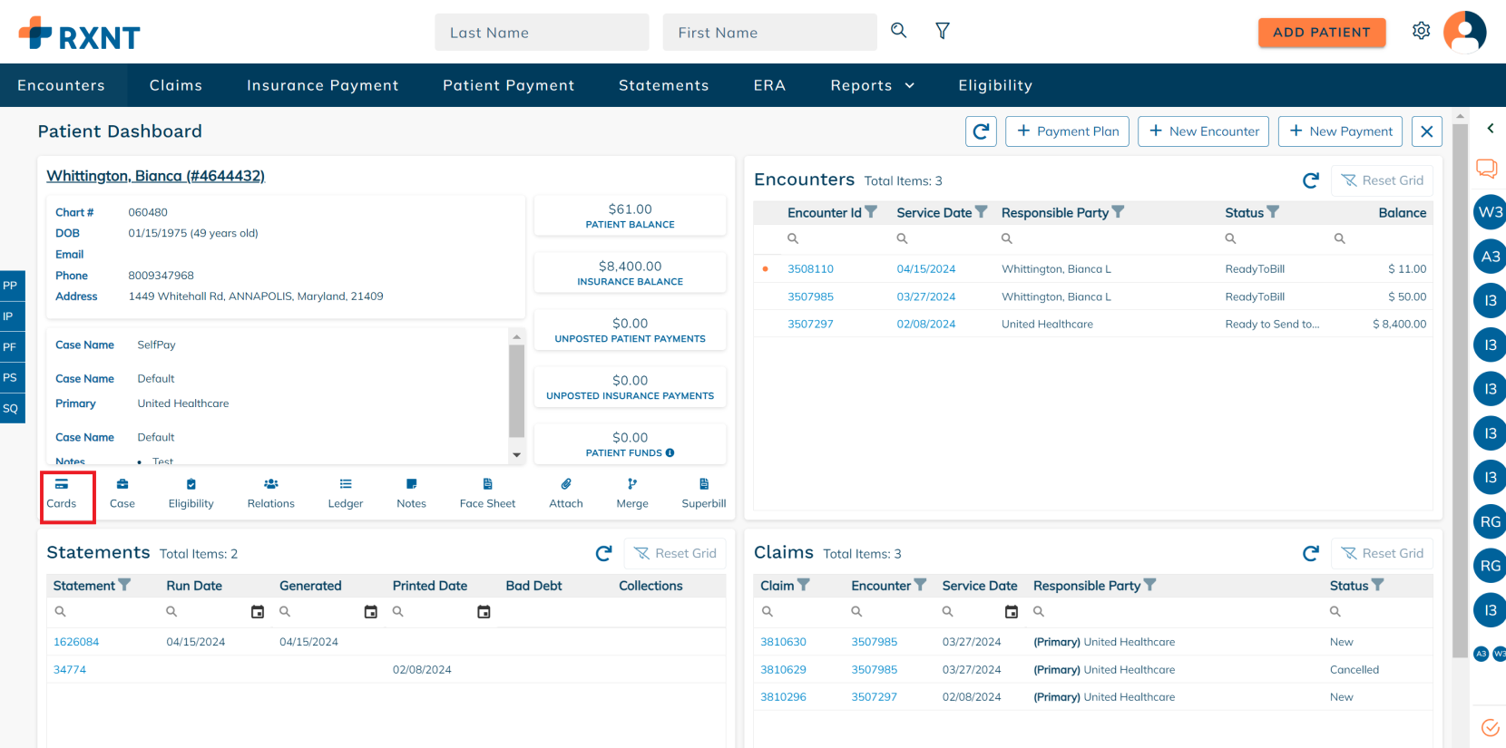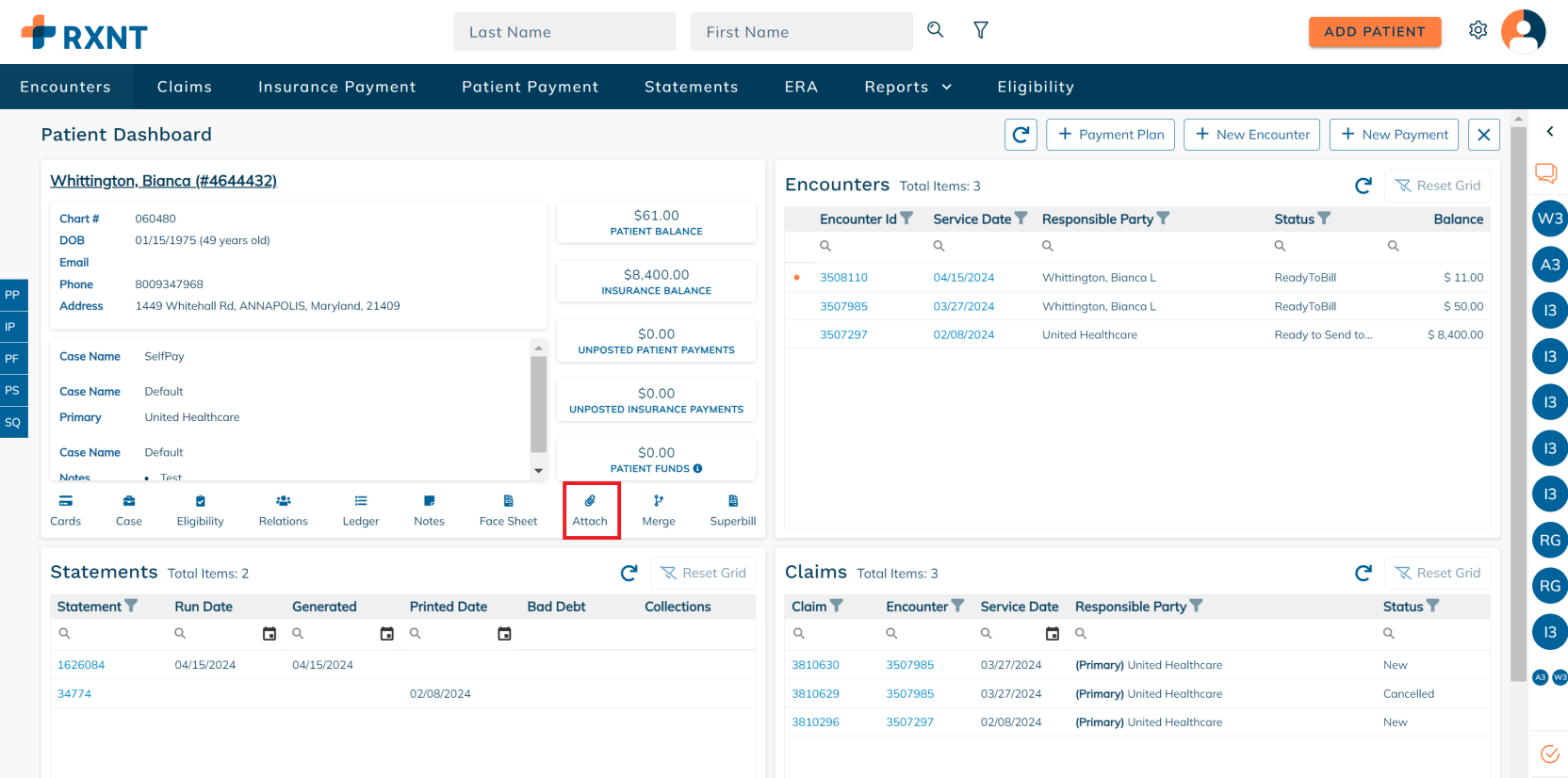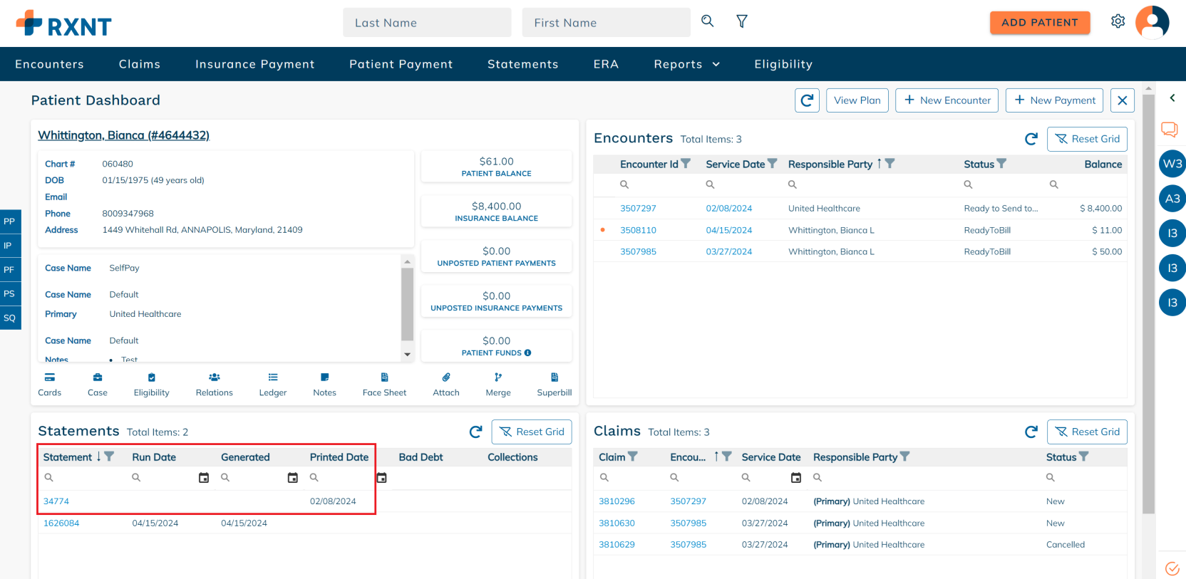 The patient dashboard provides everything you need when working on a patient account. You will see data about your patient's demogra[hics, encounters, statements, claims, and more!