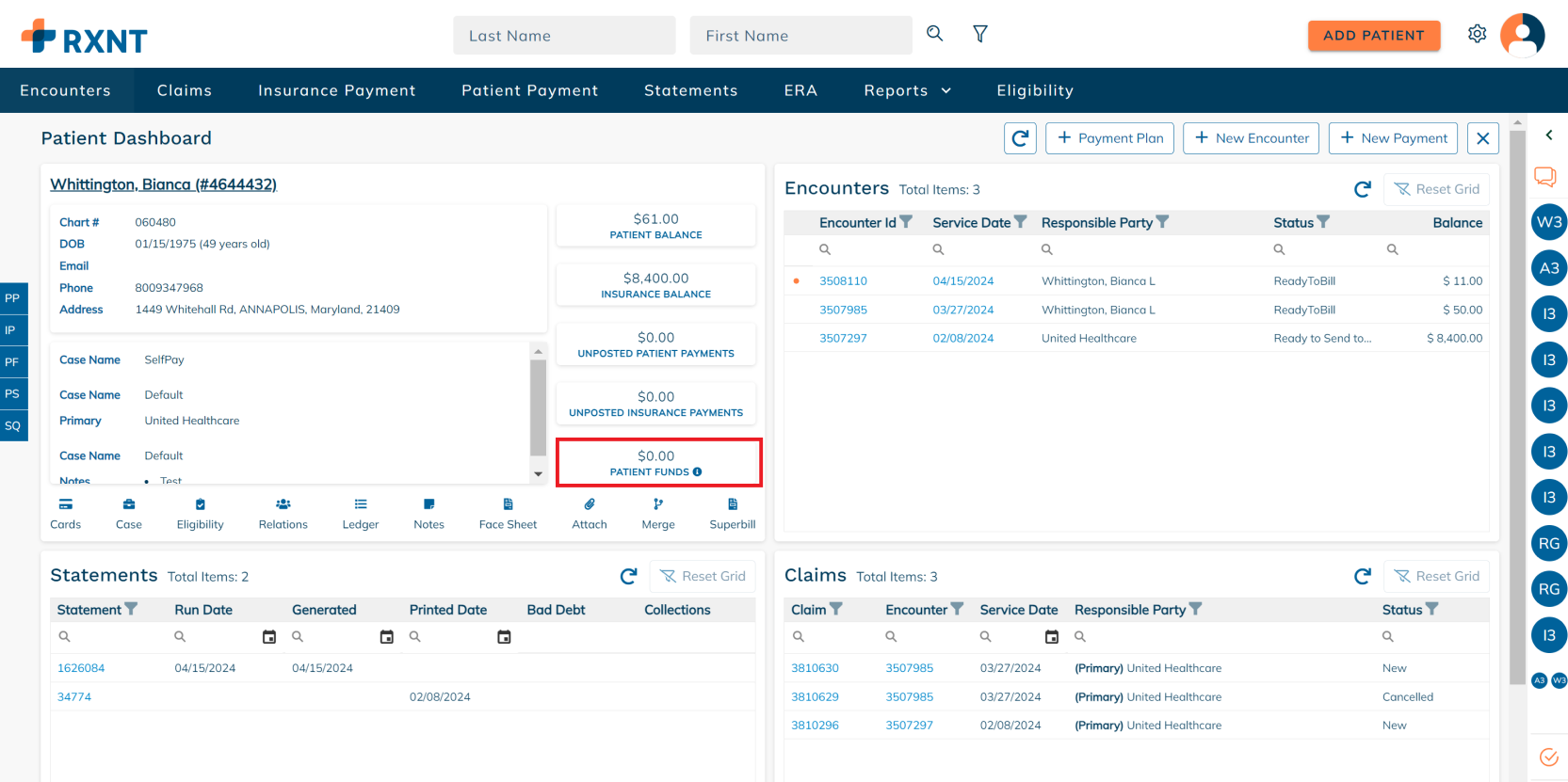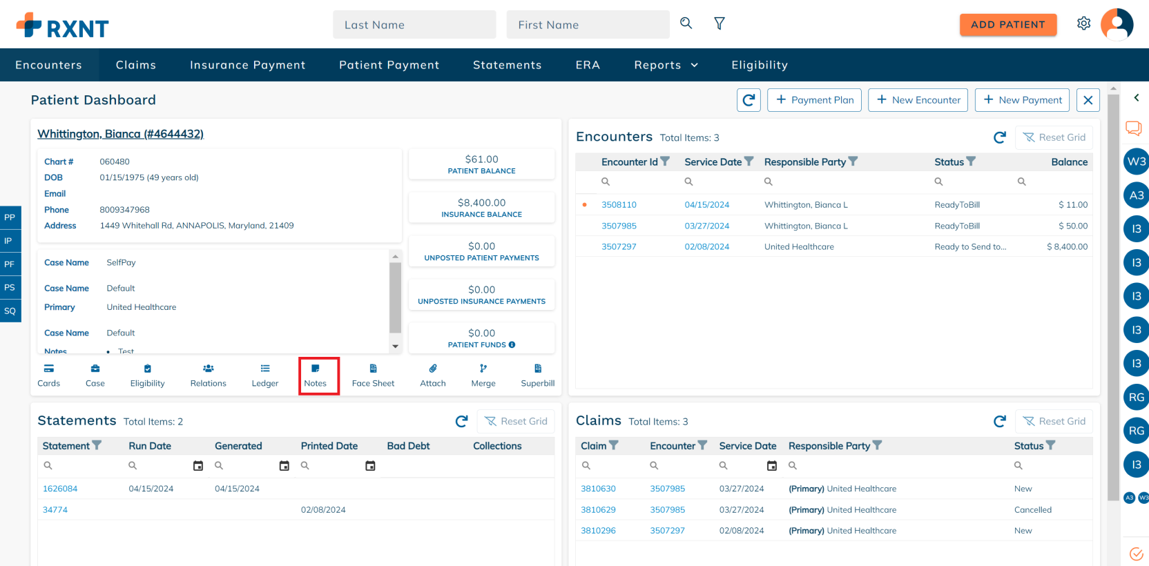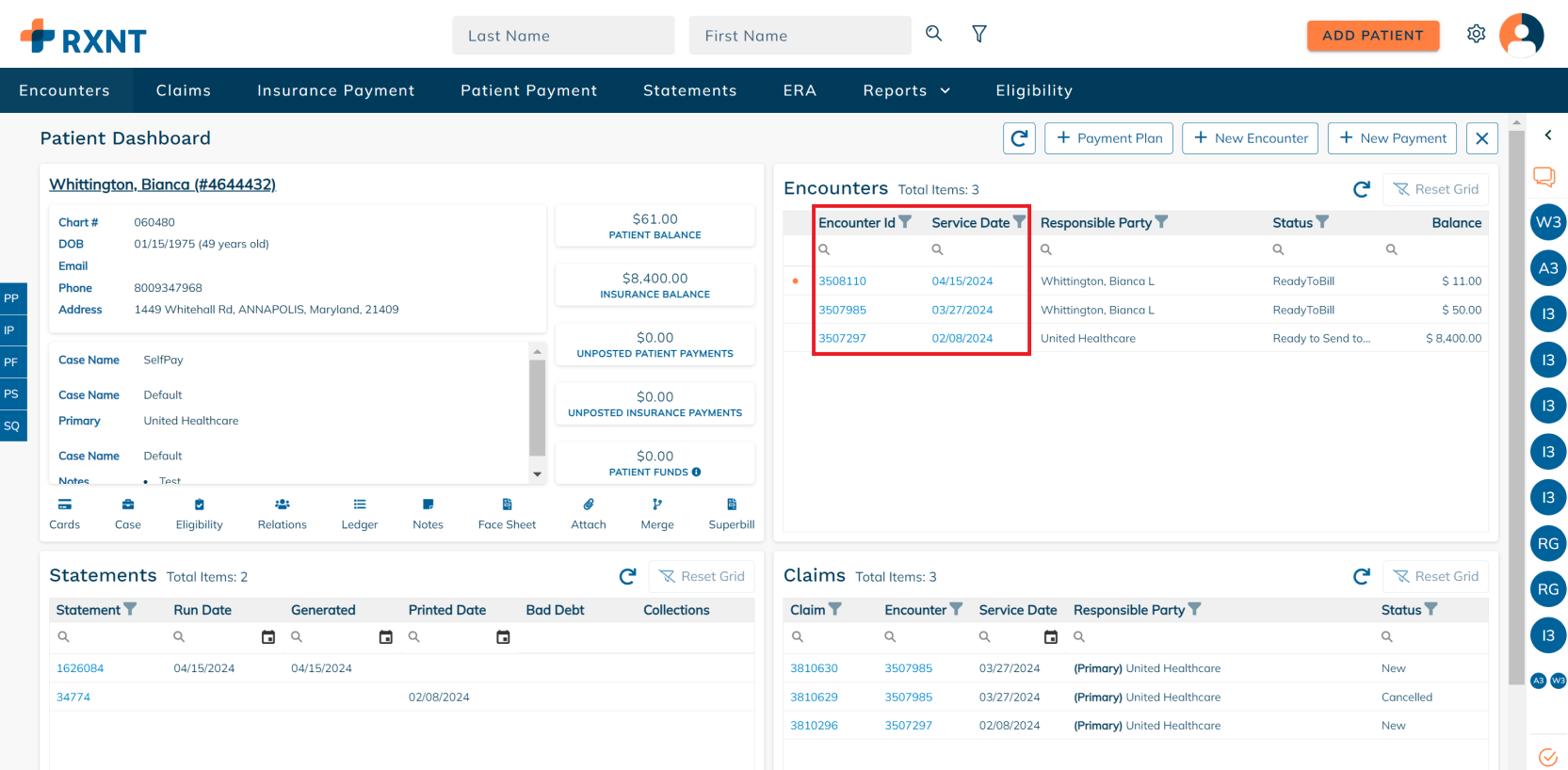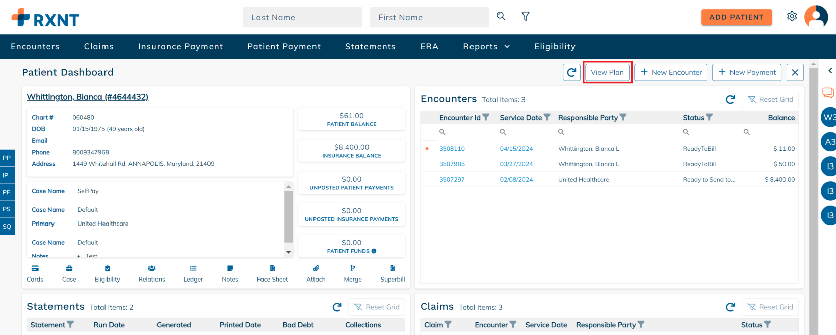 The patient dashboard provides everything you need when working on a patient account. You will see data about your patient's demogra[hics, encounters, statements, claims, and more!