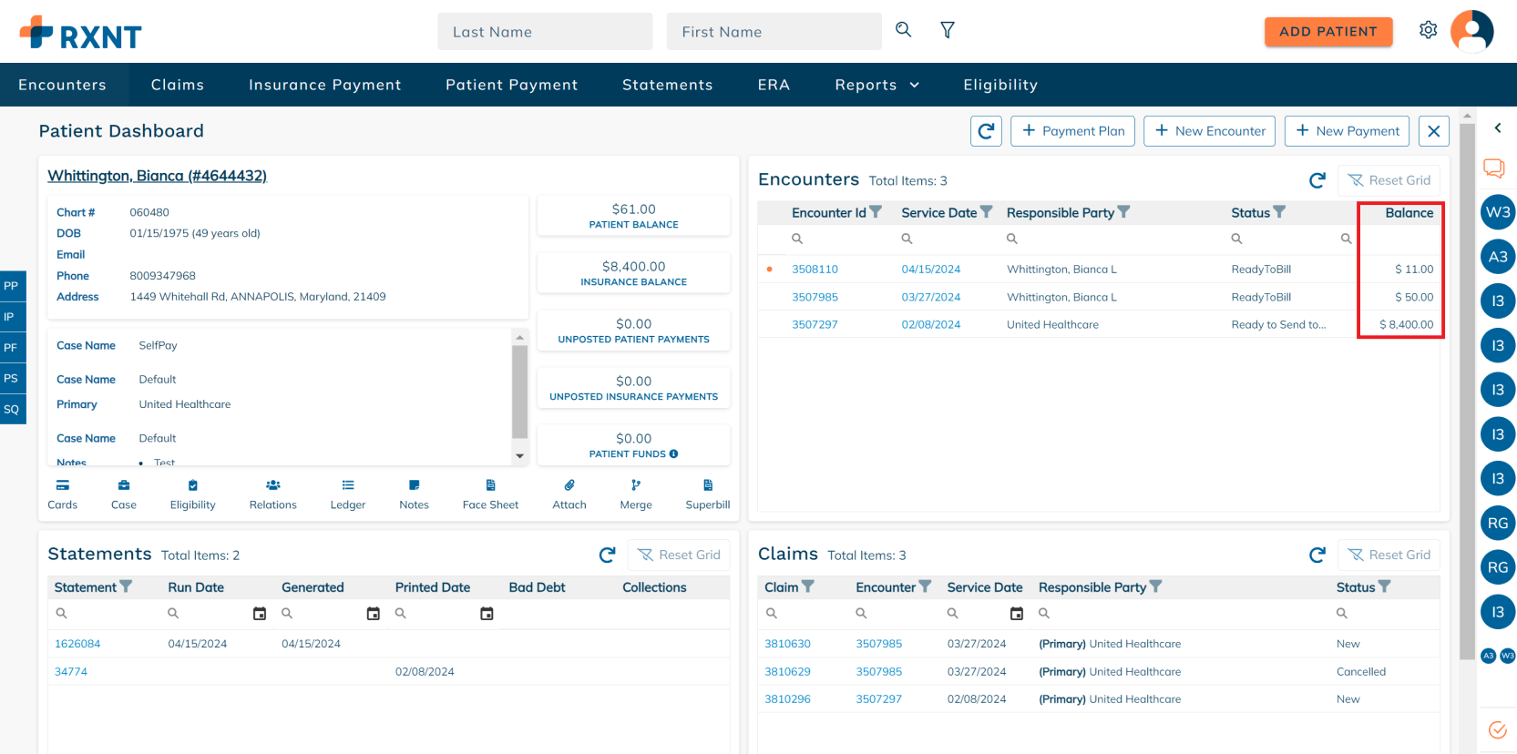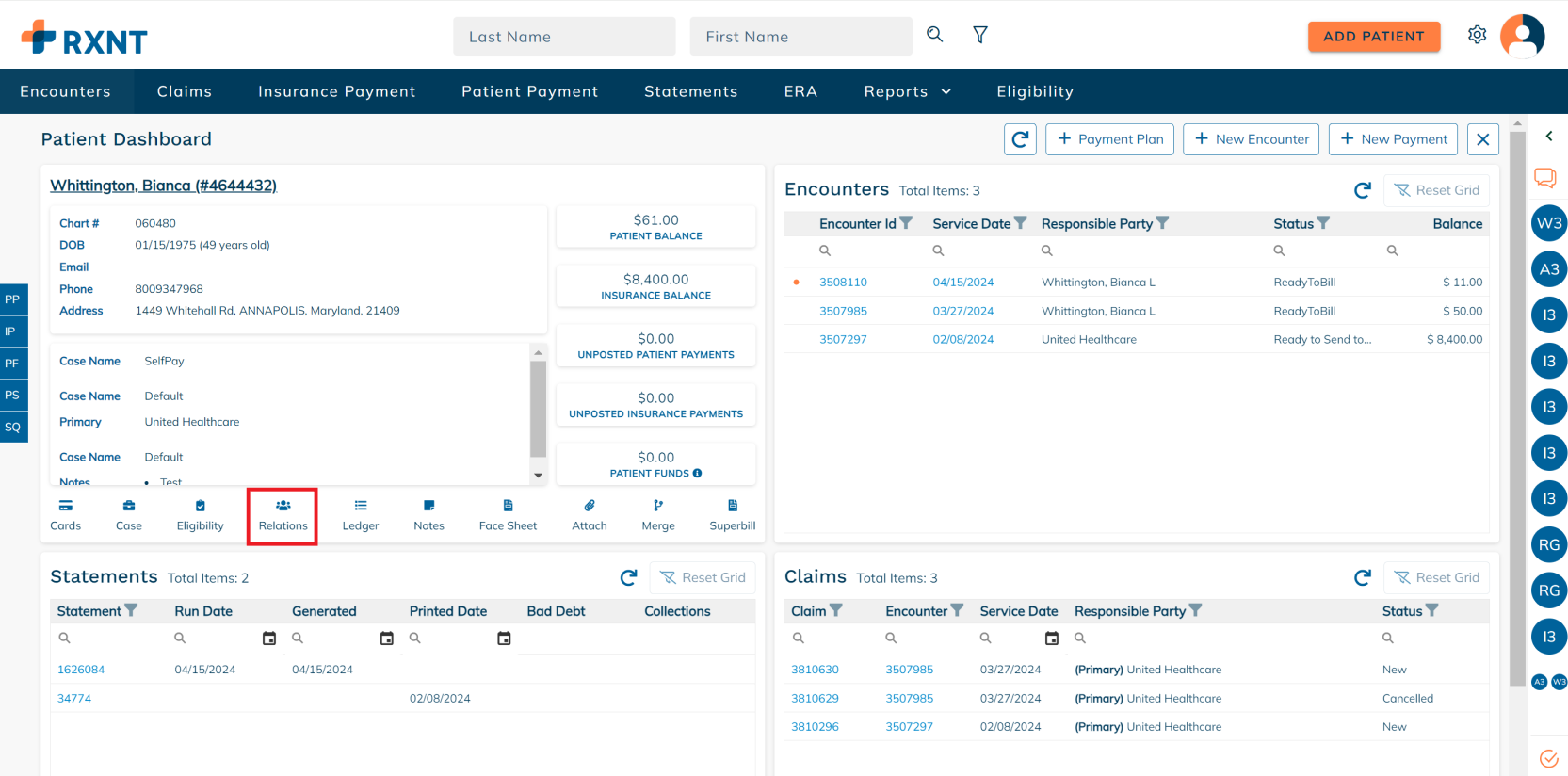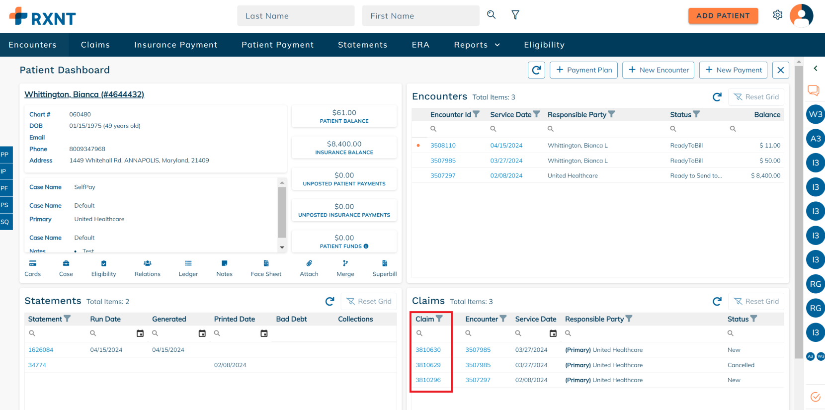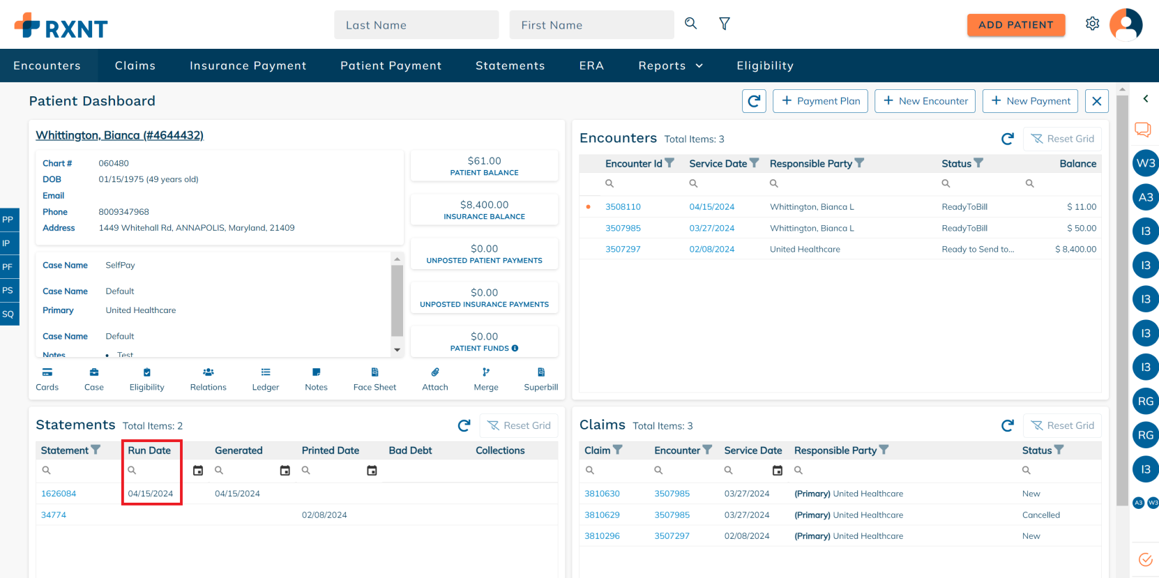 The patient dashboard provides everything you need when working on a patient account. You will see data about your patient's demogra[hics, encounters, statements, claims, and more!