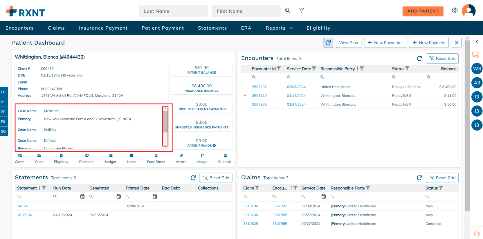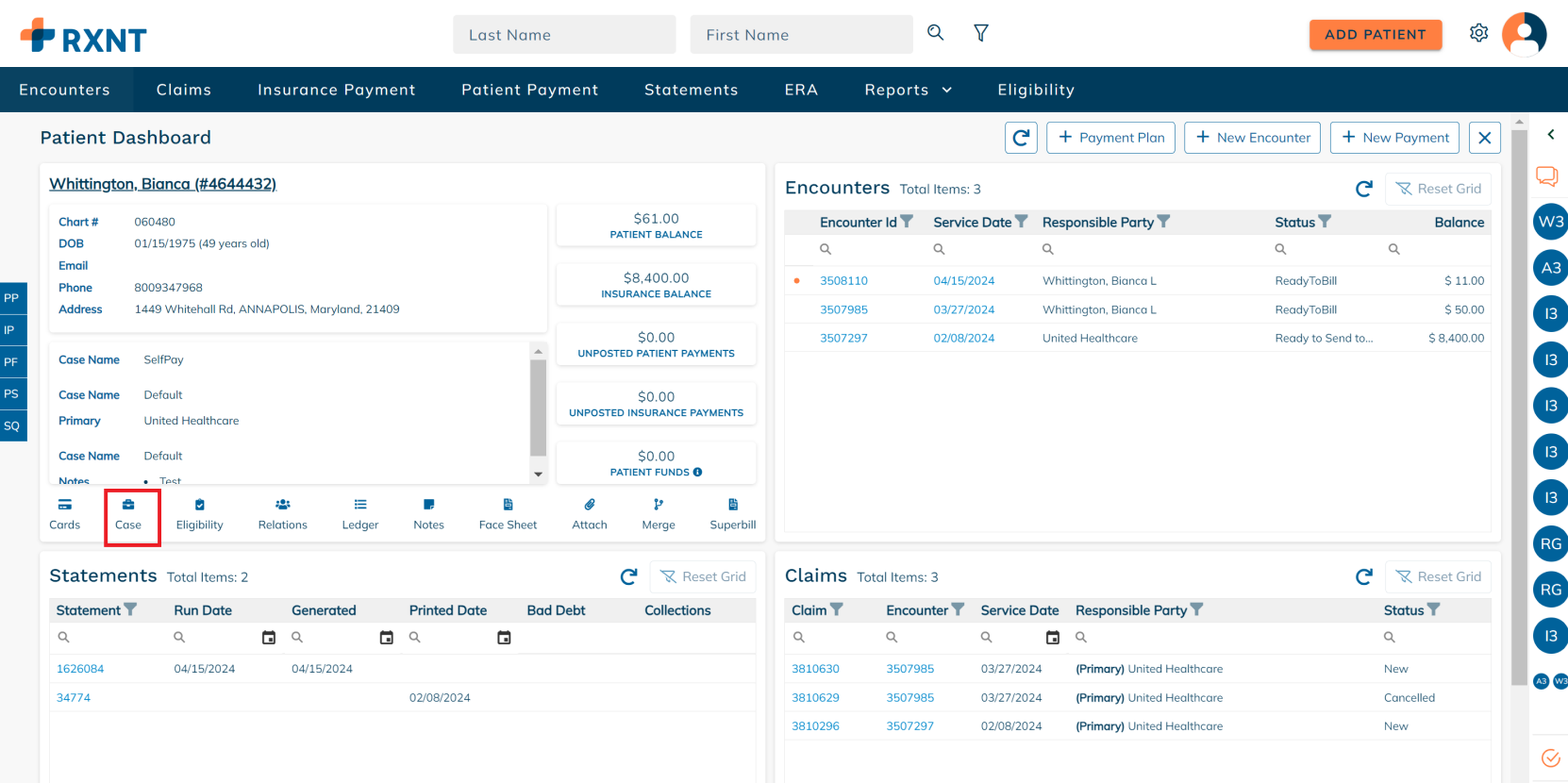Patient cases are created for both self-pay patients and those with insurance coverage. These cases serve as comprehensive repositories of patient-related information, linking directly to encounters and claims. Click here for more details on managing patient cases!