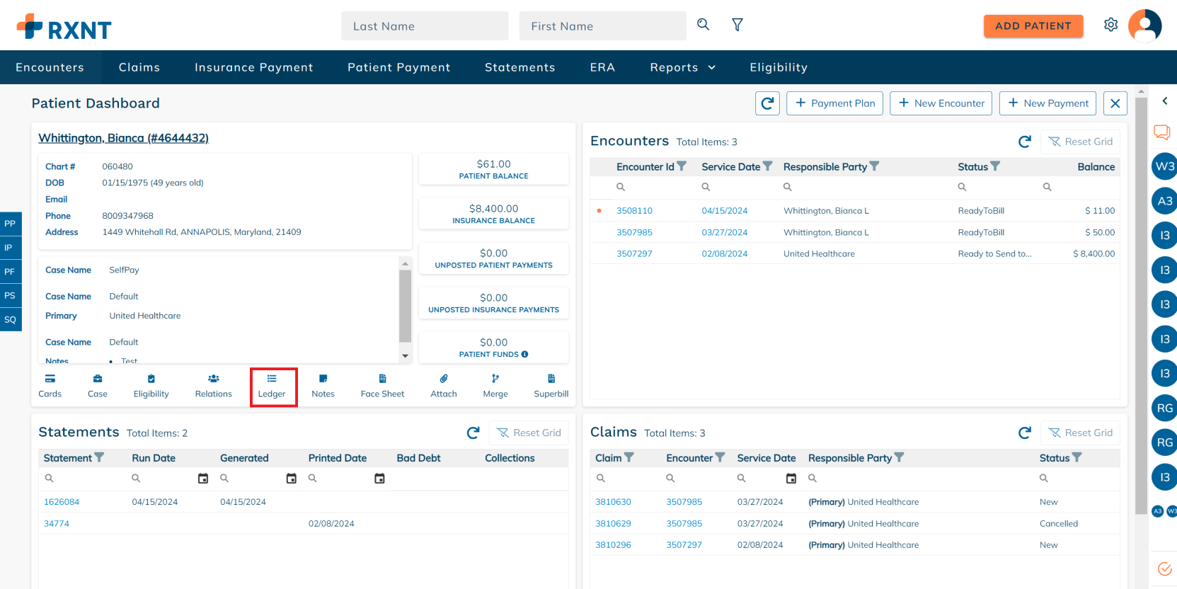 The patient ledger contains the following information: cases, encounters, unposted and posted insurance and patient payments, claims, statements, patient funds, and an overview summary. In addition, users can view and print a report of the patient ledger.