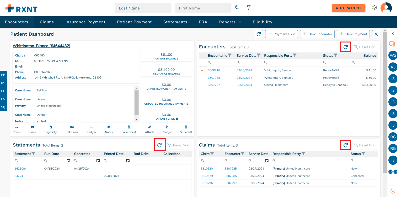 To refresh the Encounters, Claims, or Statement grid, users can simply click the Refresh button located on the top right side of each grid. By refreshing the grid, users can immediately see any new entries, updates, or changes without having to navigate away from the current screen or reload the entire page.