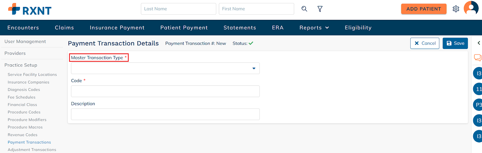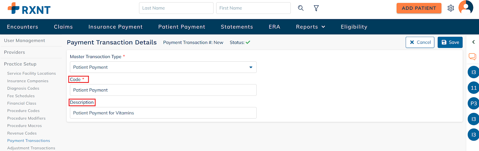 Manually enter the payment transaction code in the Code field. For example, if you selected Patient Payment as the Master Transaction Type, you may want to enter a code such as PPAY to represent a standard patient payment or another code your organization uses for tracking specific payment types. Then, enter a description in the Description field, if applicable, to provide additional context for the transaction.