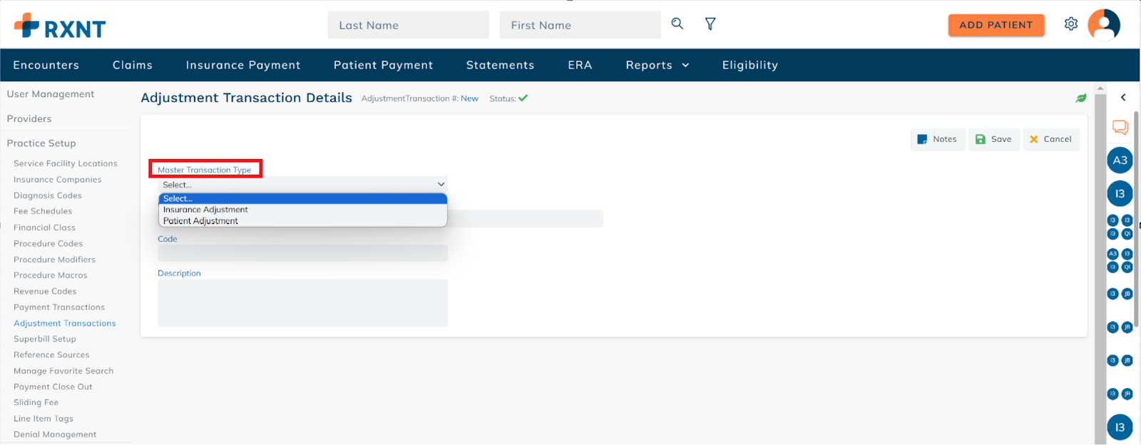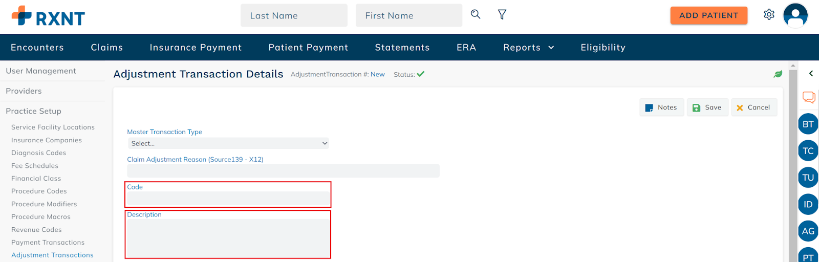 If you’re creating a Patient Adjustment, you can either select an existing Denial Code from the Claim Adjustment Reason dropdown list or create your own custom code by entering a unique name in the Code field. If applicable, provide additional context by entering a detailed explanation in the Description field. Creating your own code is useful when the adjustment reason doesn’t fit any of the standard claim adjustment codes provided.