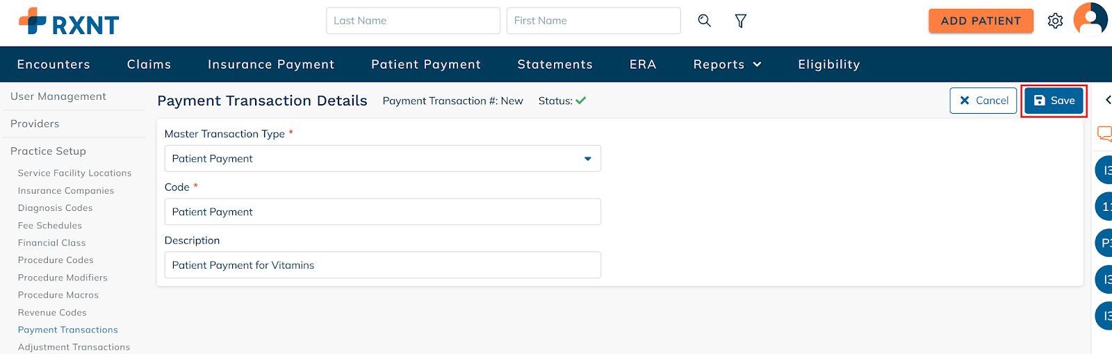 Payment and Adjustment transactions are used when creating and posting payments in the system. Once set up, they allow you to accurately categorize and track different types of financial activity, ensuring consistency in your billing records. When entering a payment, you’ll select the appropriate transaction type to reflect the nature of the payment or adjustment being recorded. When entering a payment, you’ll select the appropriate transaction type to reflect the nature of the payment or adjustment being recorded.