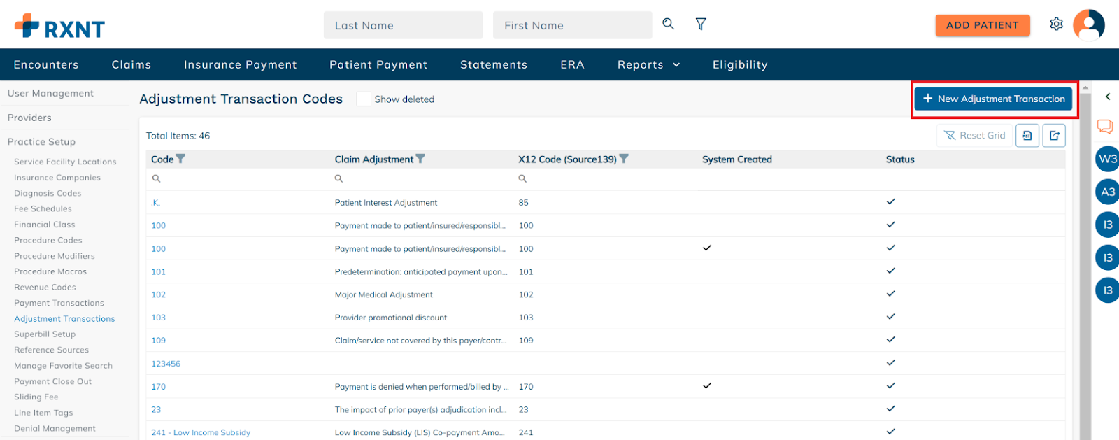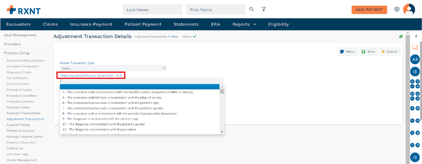 If you’re creating an Insurance Adjustment, be sure to select the appropriate Denial Code from the Claim Adjustment Reason dropdown list. Denial codes are standardized codes used to explain why all or part of a claim was not paid by the insurance company. Selecting the correct code ensures that the reason for the adjustment is properly documented and can be accurately reported or appealed if needed.