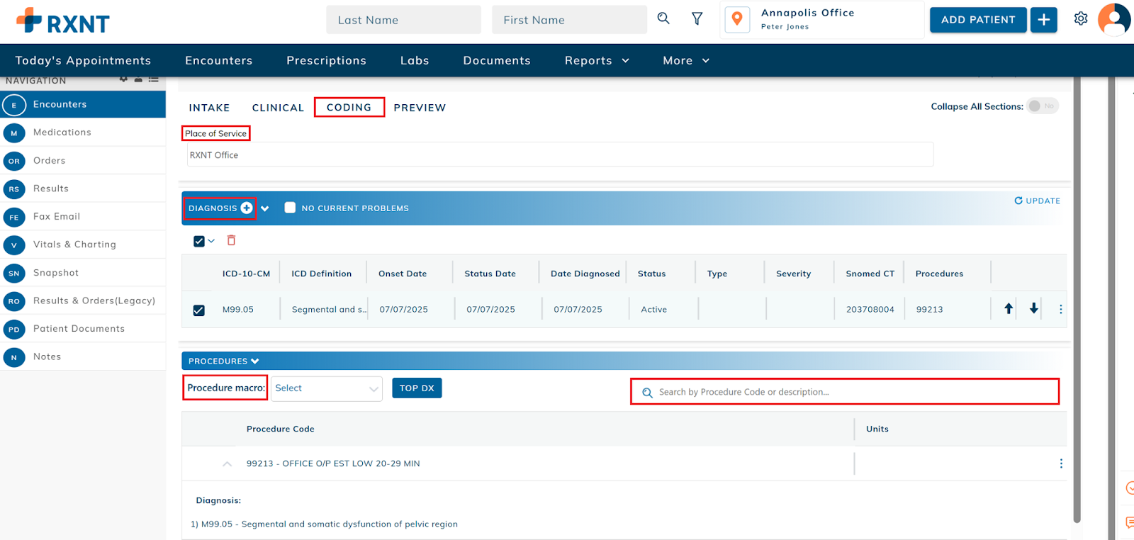 When you click on the Coding tab, you'll have the option to include the Place Service, Diagnosis Codes, Procedure Codes, and a Procedure Macro.