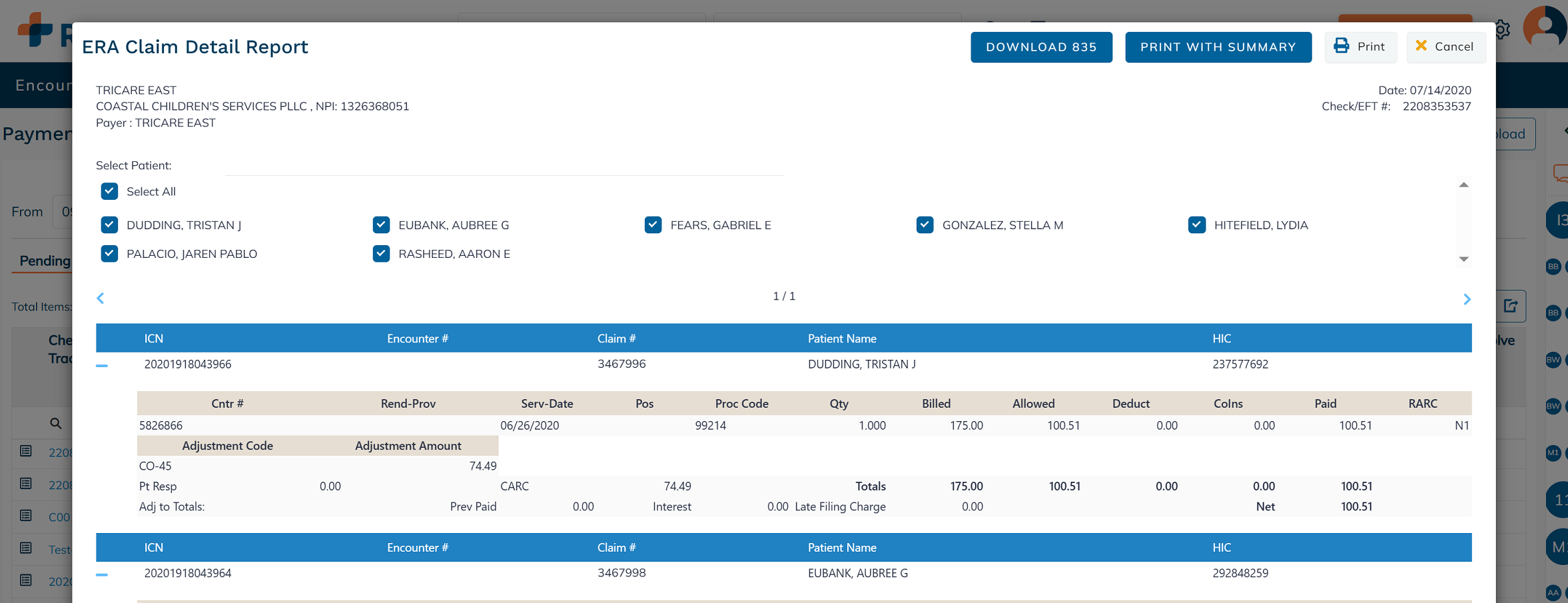 To view payments for specific patients only, click the Checkbox next to the desired patient’s name.