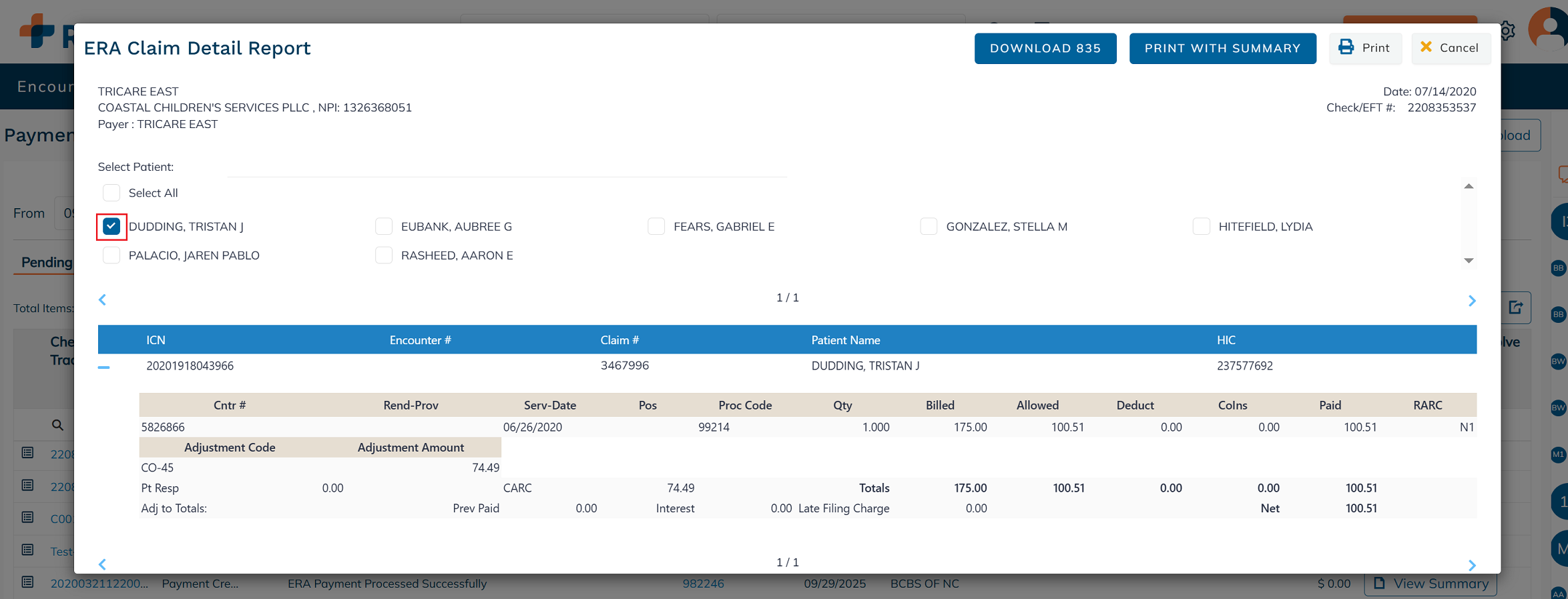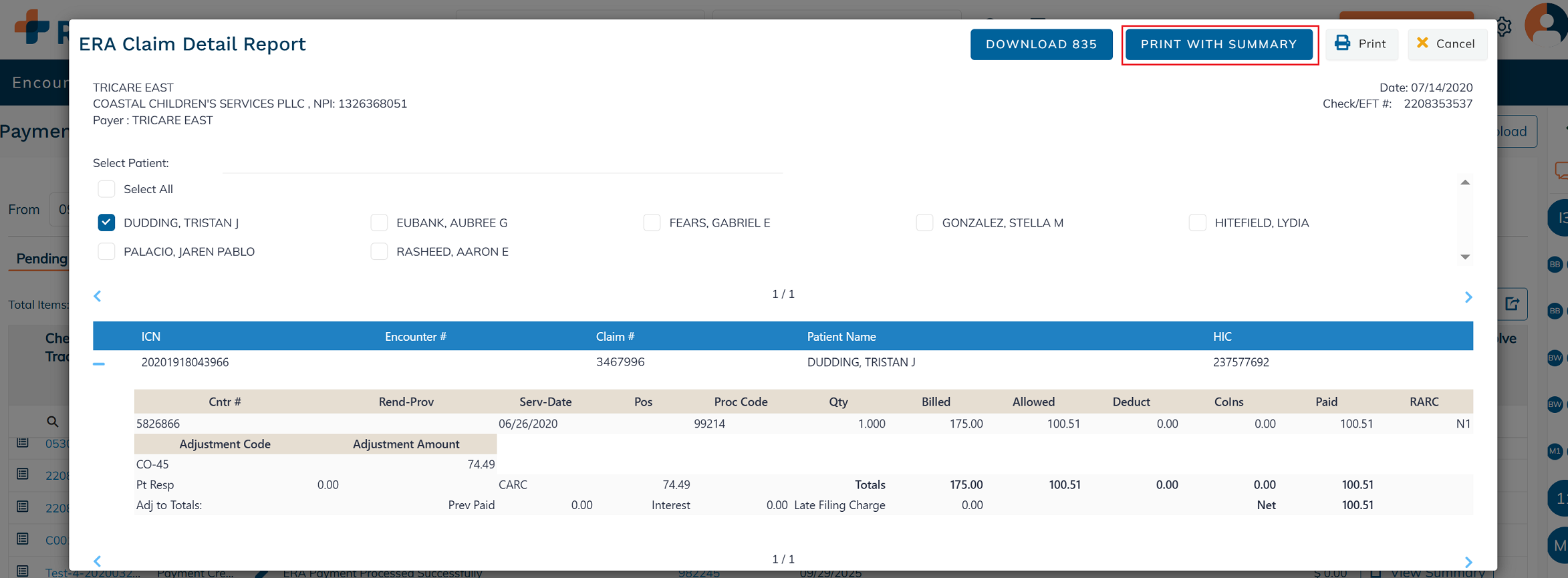 To print the ERA summary along with the ERA details, click Print With Summary.