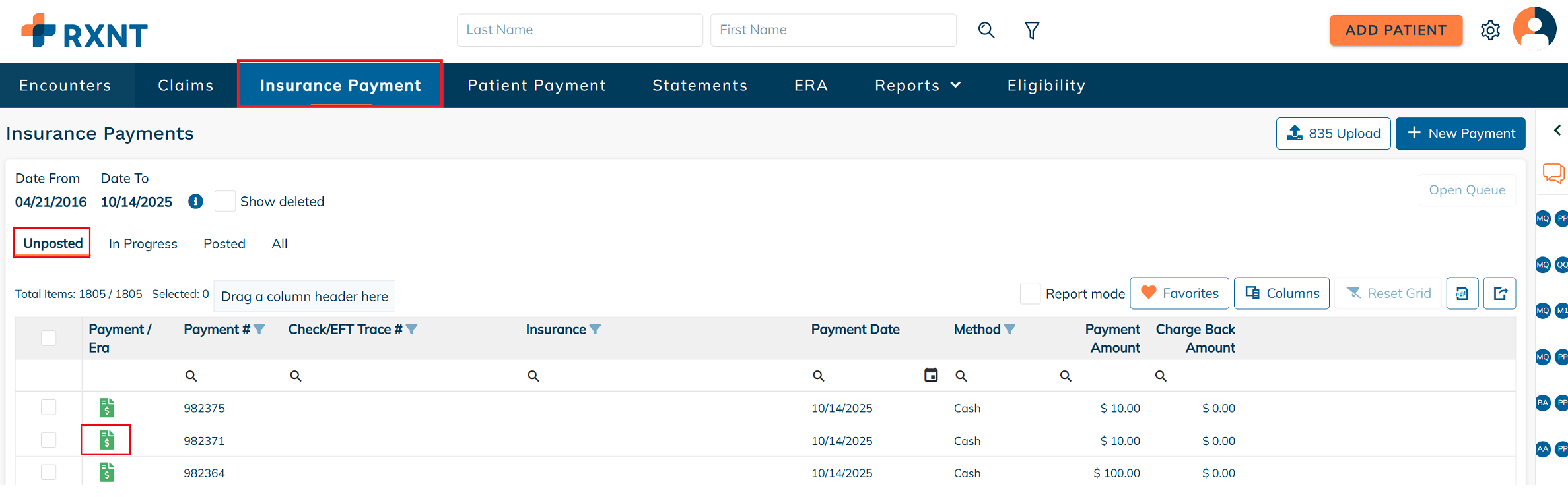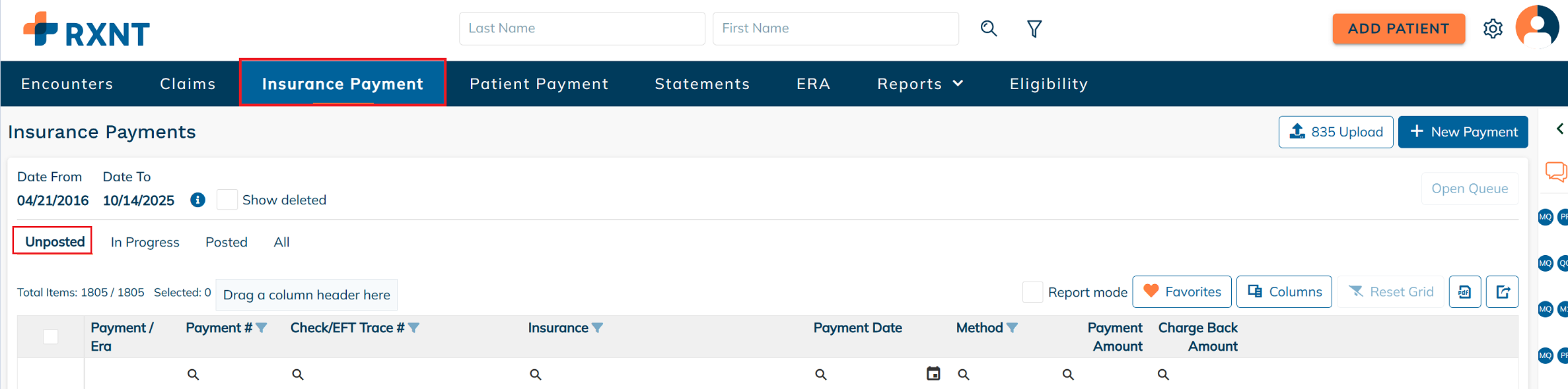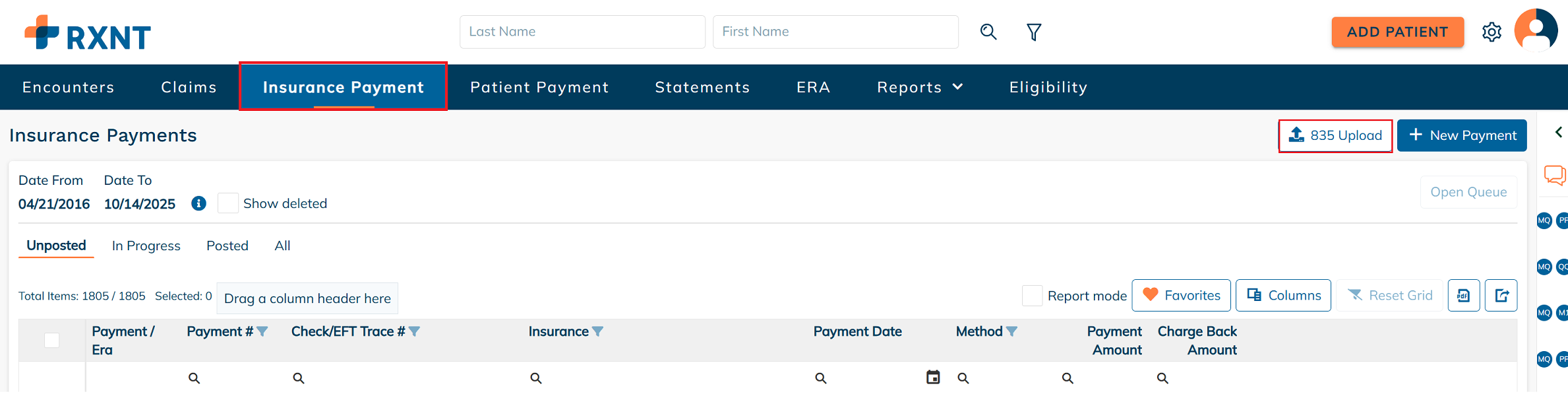 From either the Insurance Payment tab or the ERA tab, click 835 Upload to begin the file upload process.