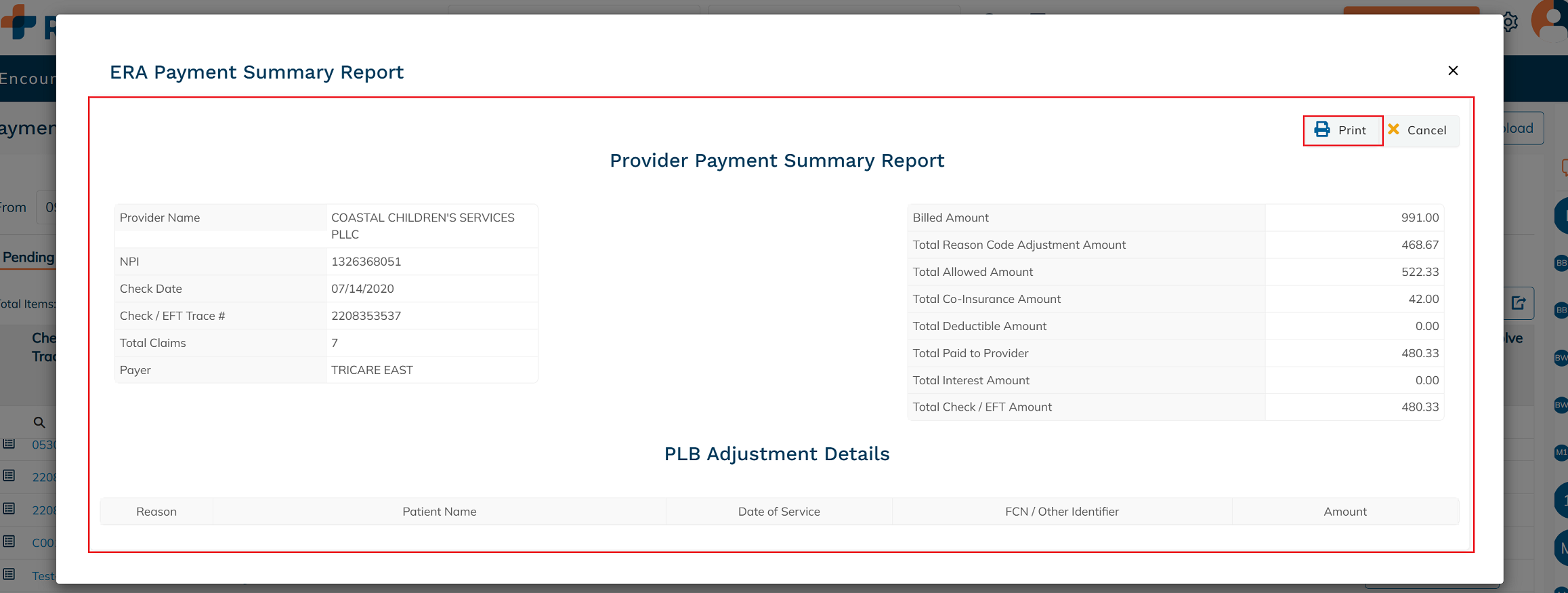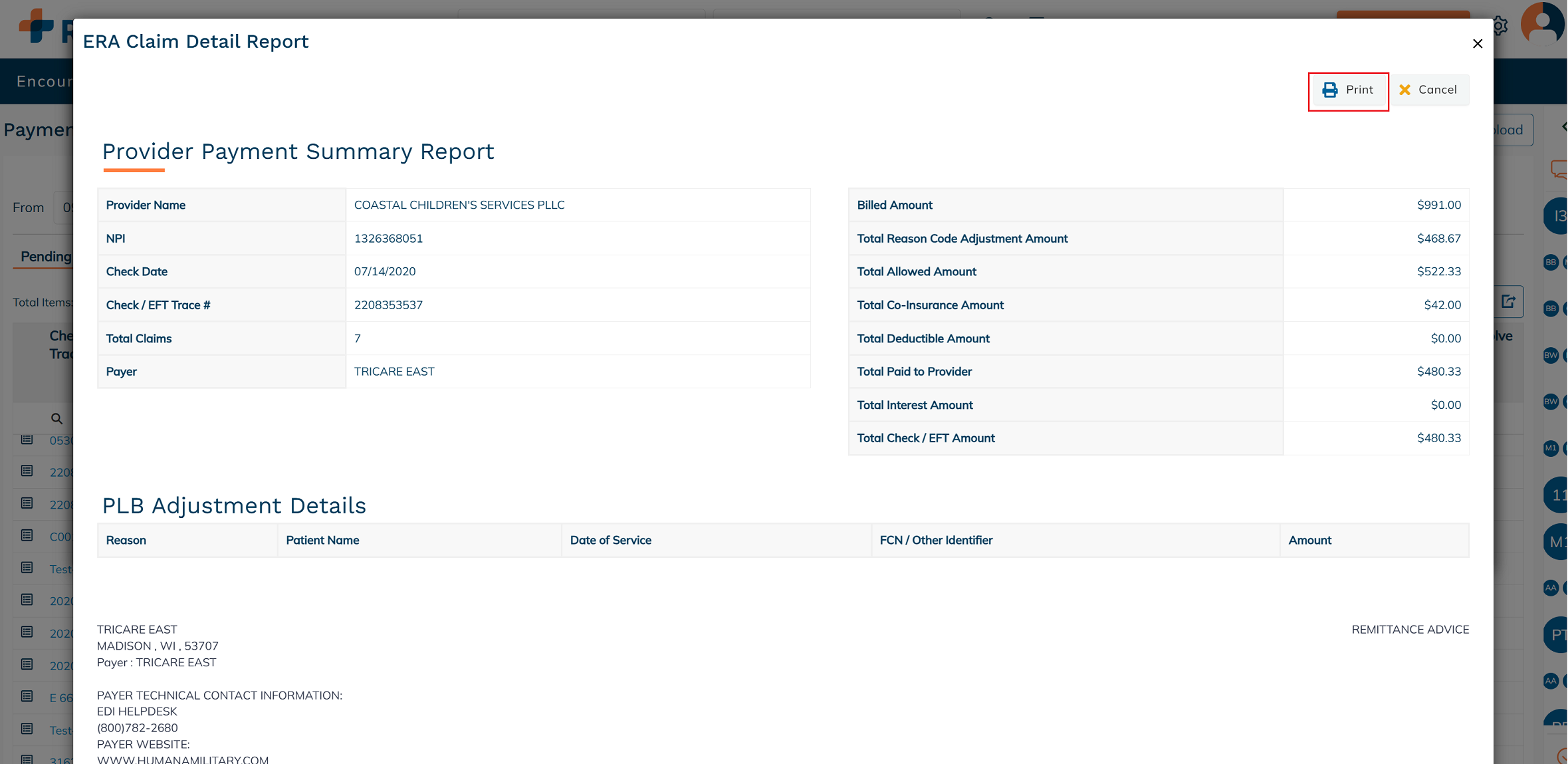 The report displays key provider information along with a breakdown of payment and adjustment details related to the remittance. If applicable, PLB (Provider-Level Balance) Adjustment Details will appear at the bottom of the report. These adjustments are made at the provider level rather than for individual claims and may include items such as refunds, prior payment recoveries, interest payments, or withholdings. Reviewing these details helps ensure accurate reconciliation of the total payment amount received. To print the summary report, click Print.