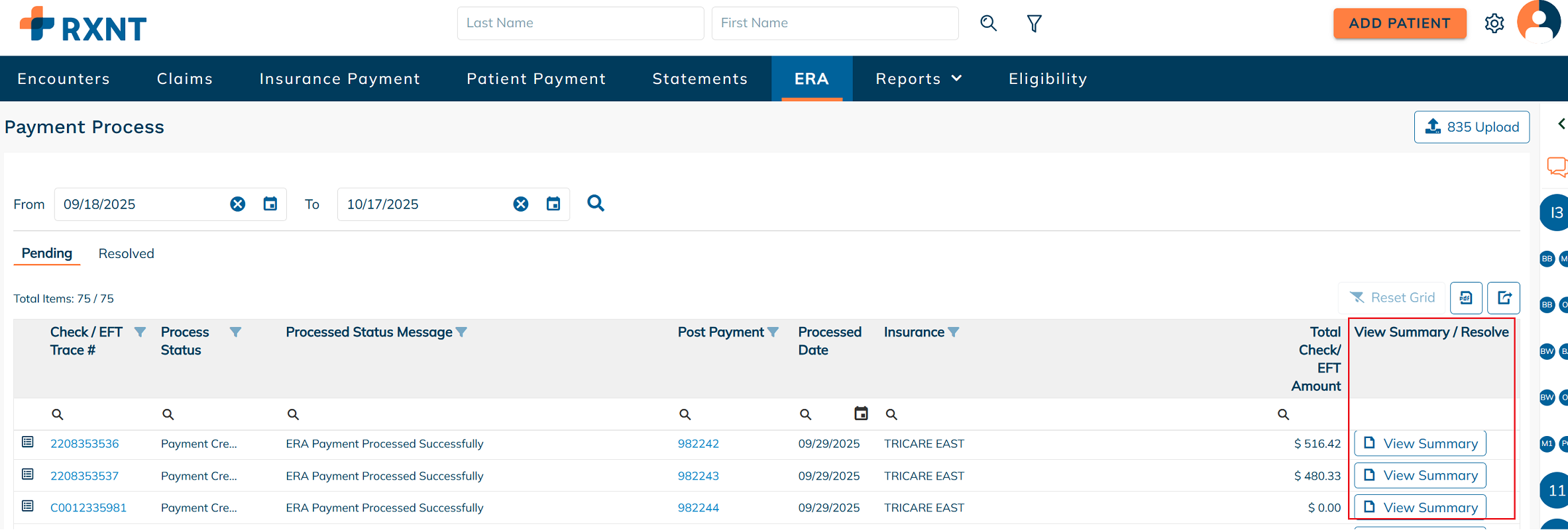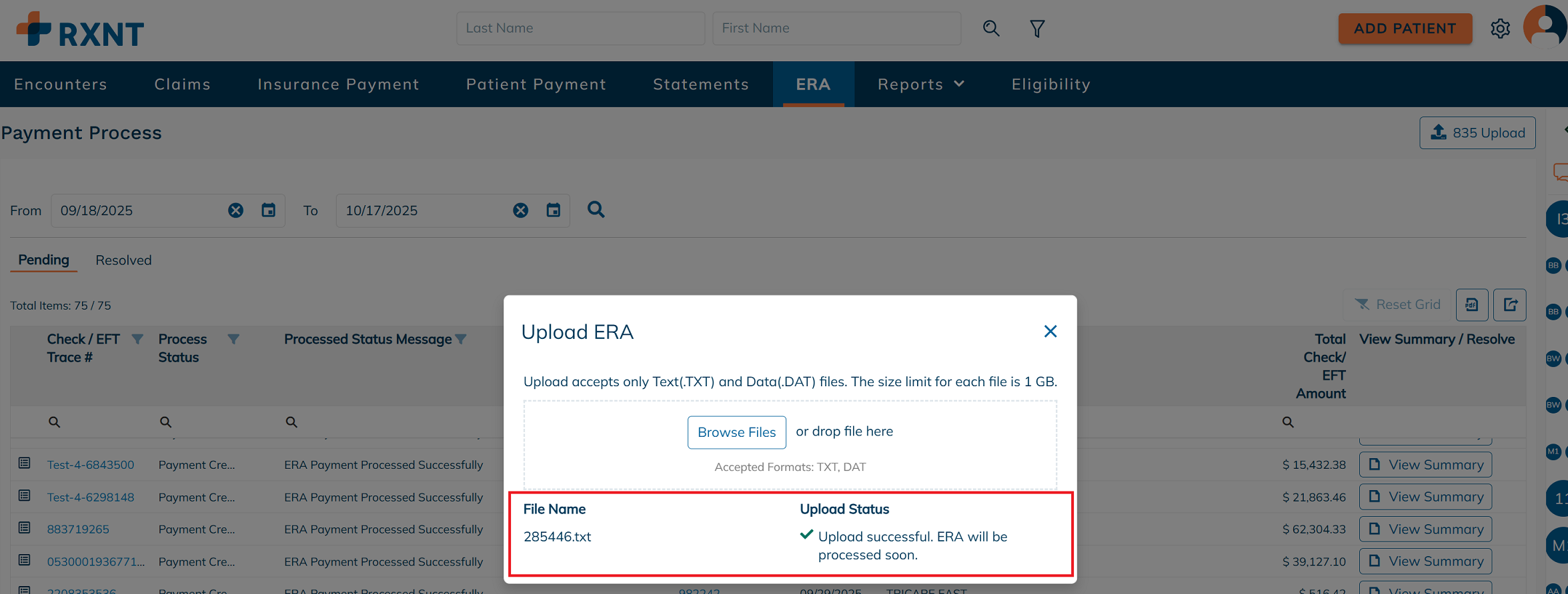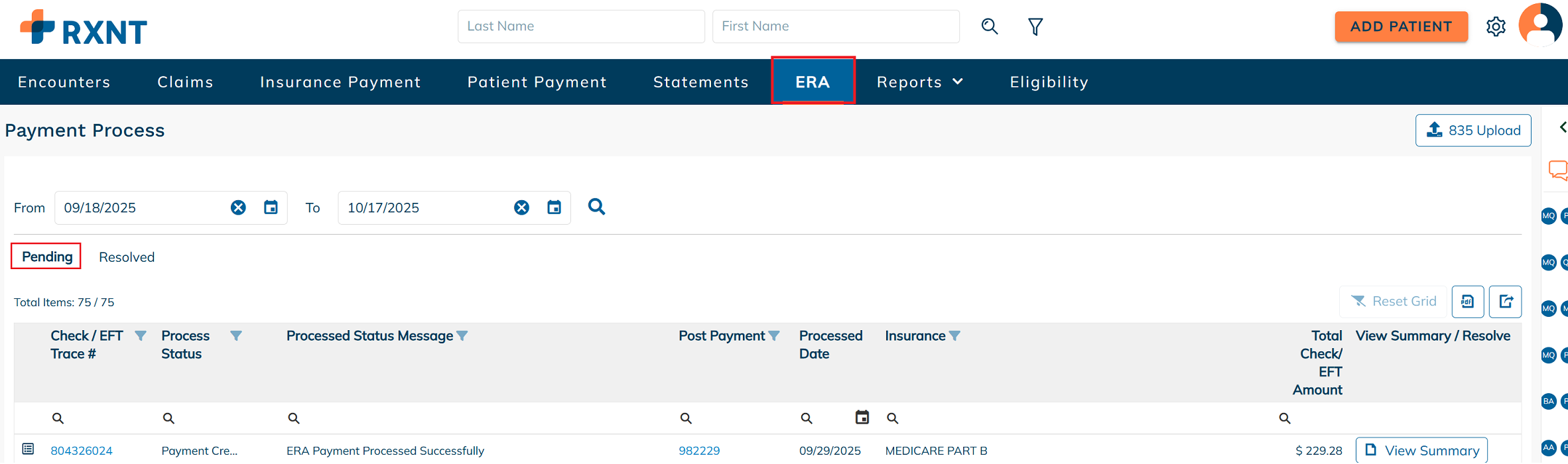 After the 835 file is successfully uploaded, it will appear in the Pending ERAs tab for further processing.