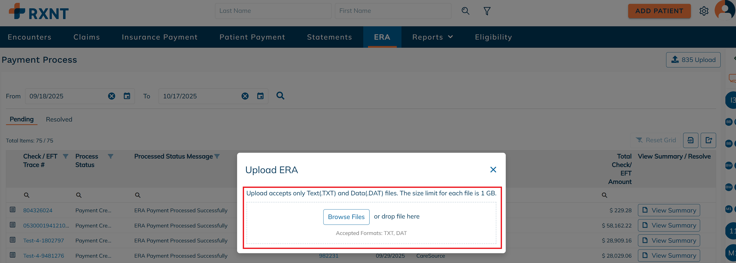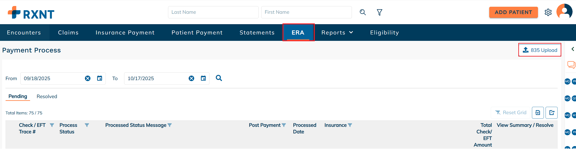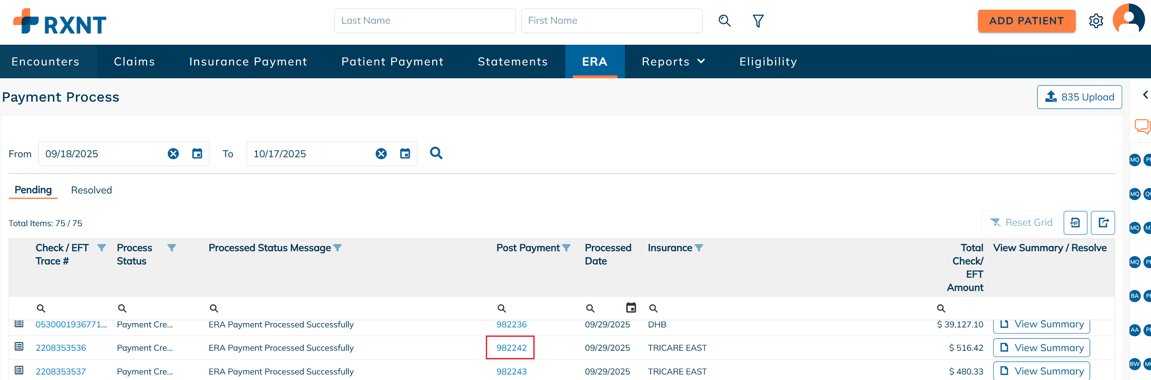 After the 835 file is successfully uploaded, it will appear in the Pending ERAs tab for further processing.