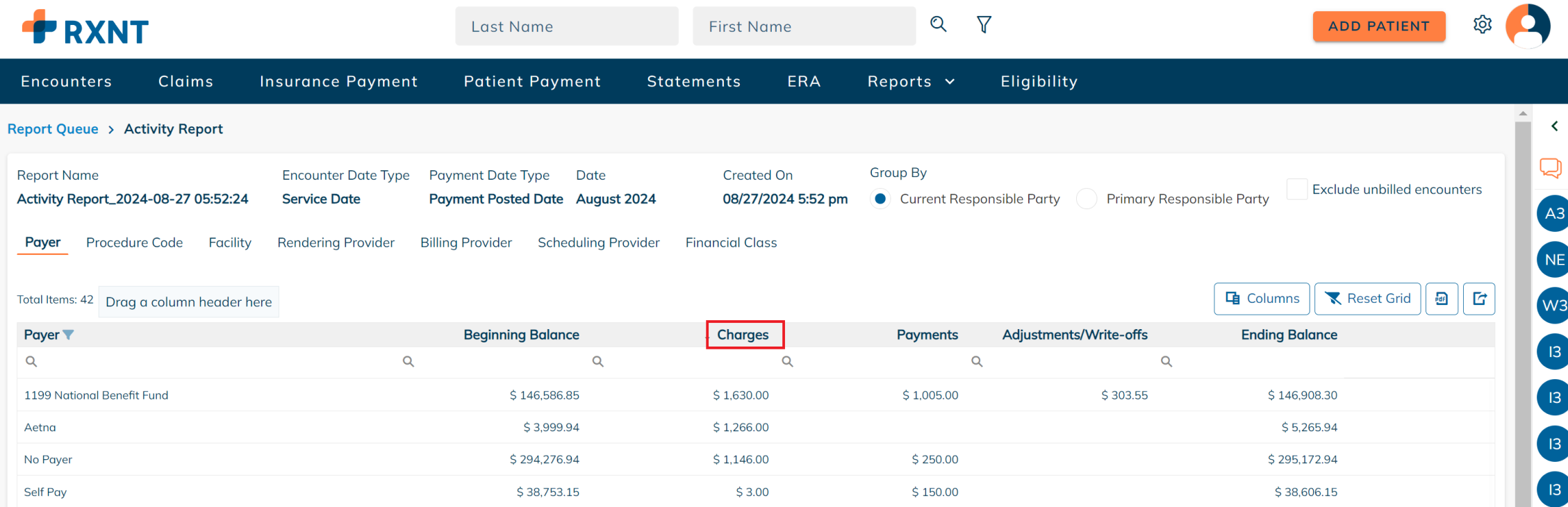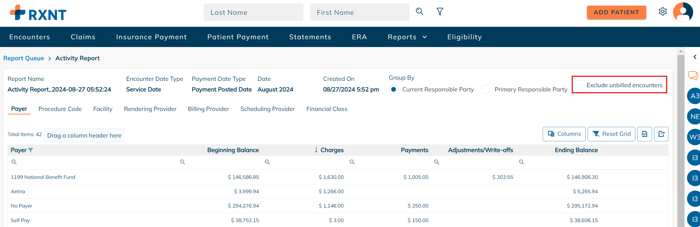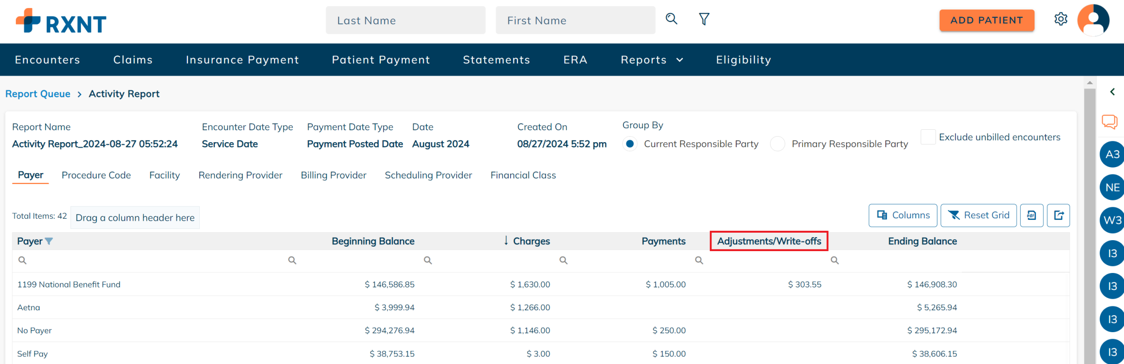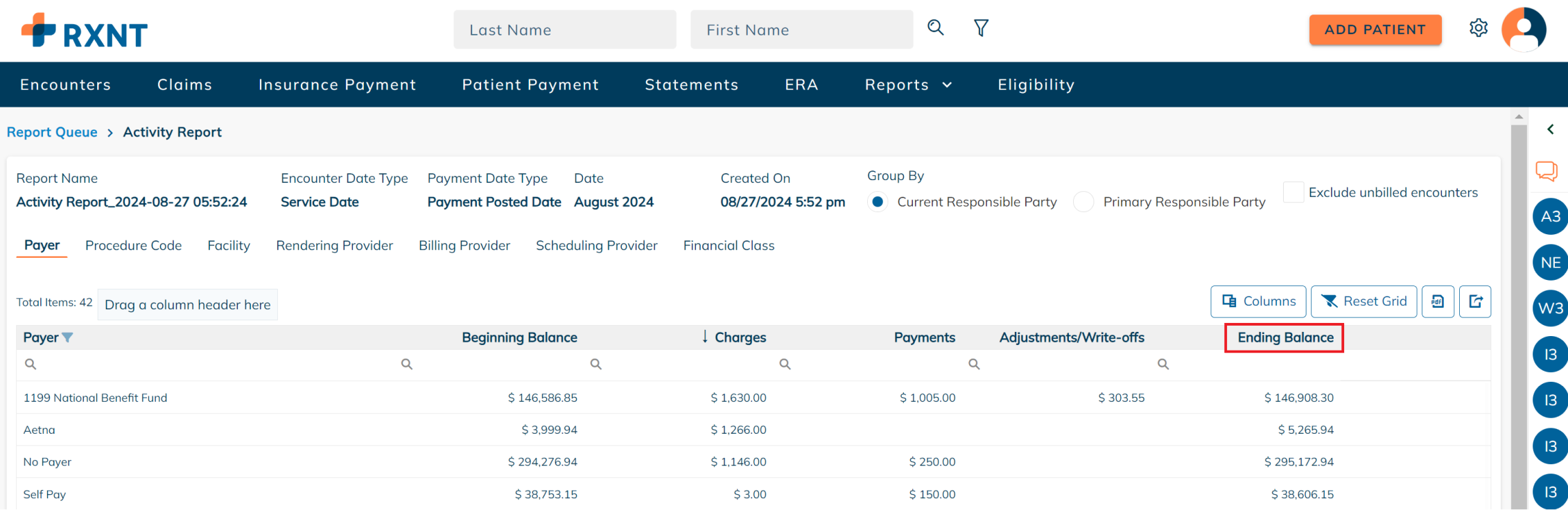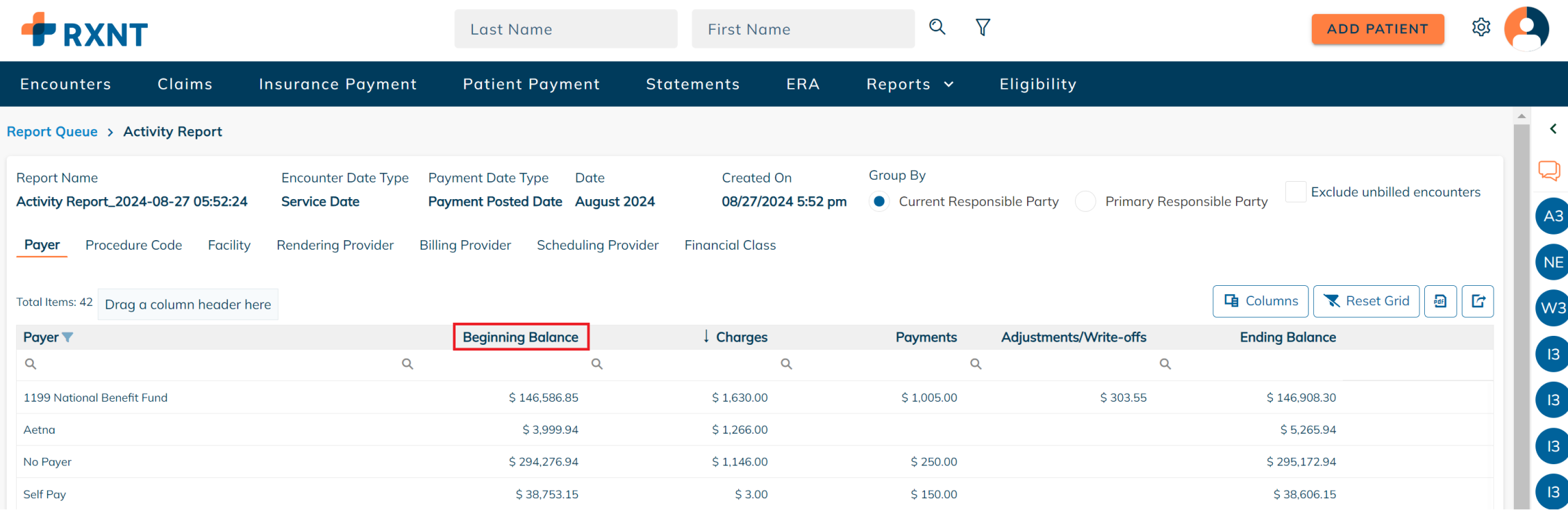 RXNT's Activity Report provides a monthly snapshot that shows the beginning balance, the total charges, payments, adjustments, and write-offs, and the ending balance for the period selected.