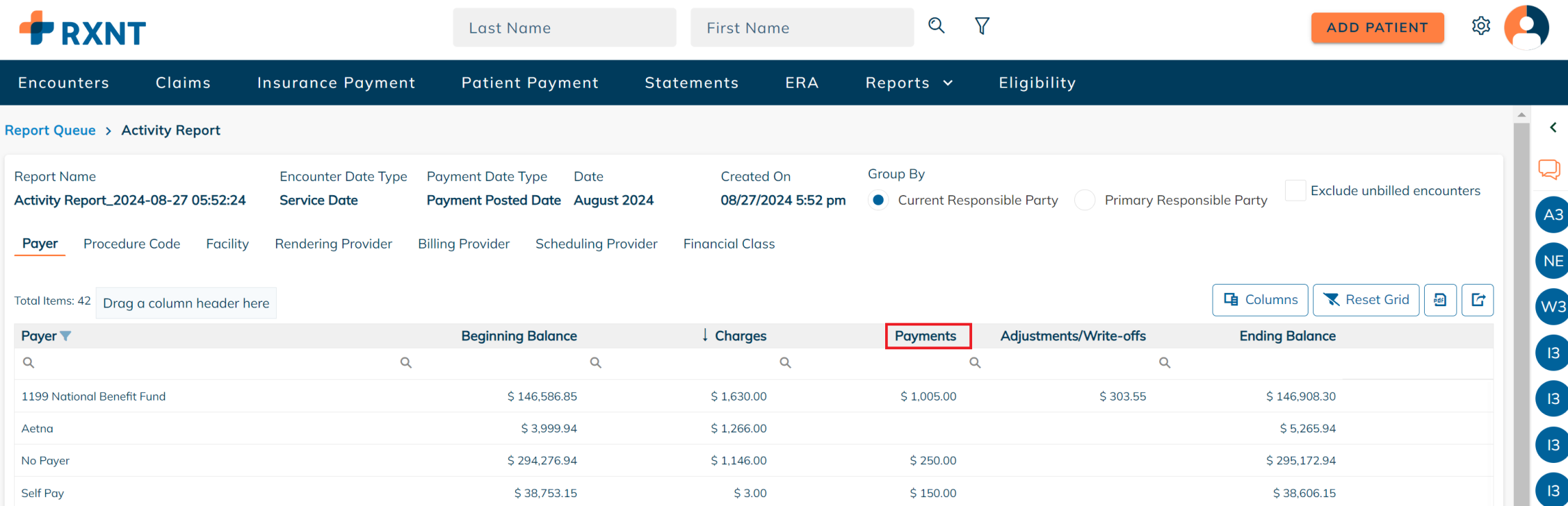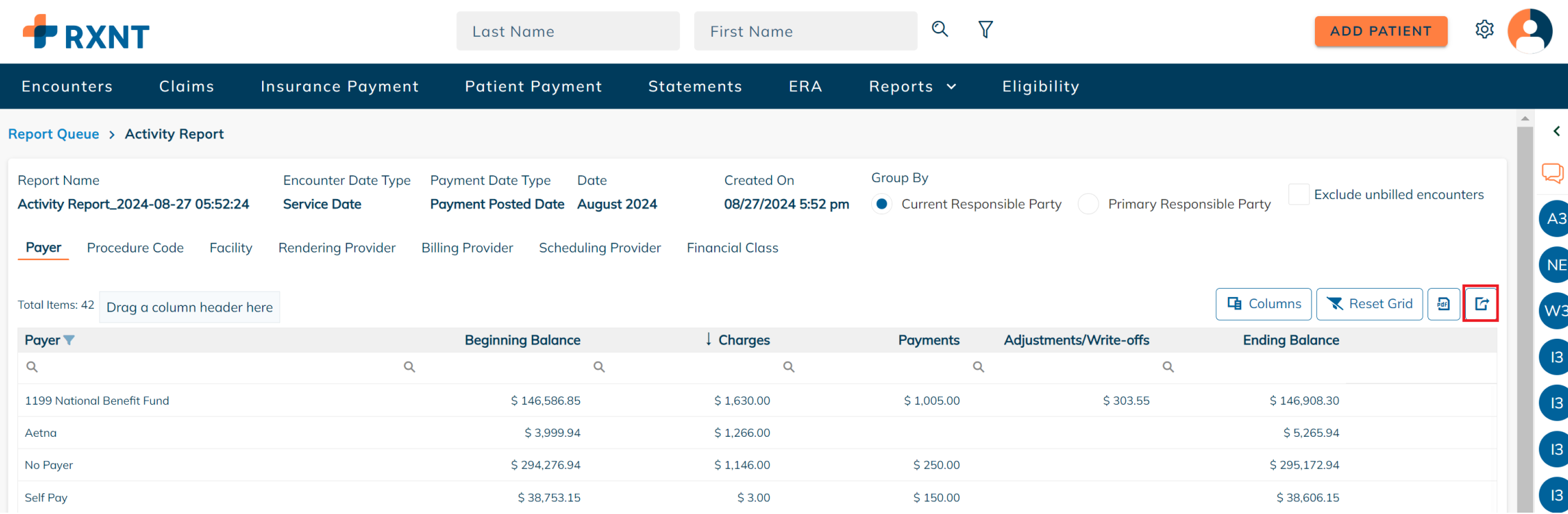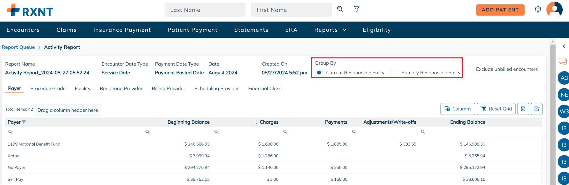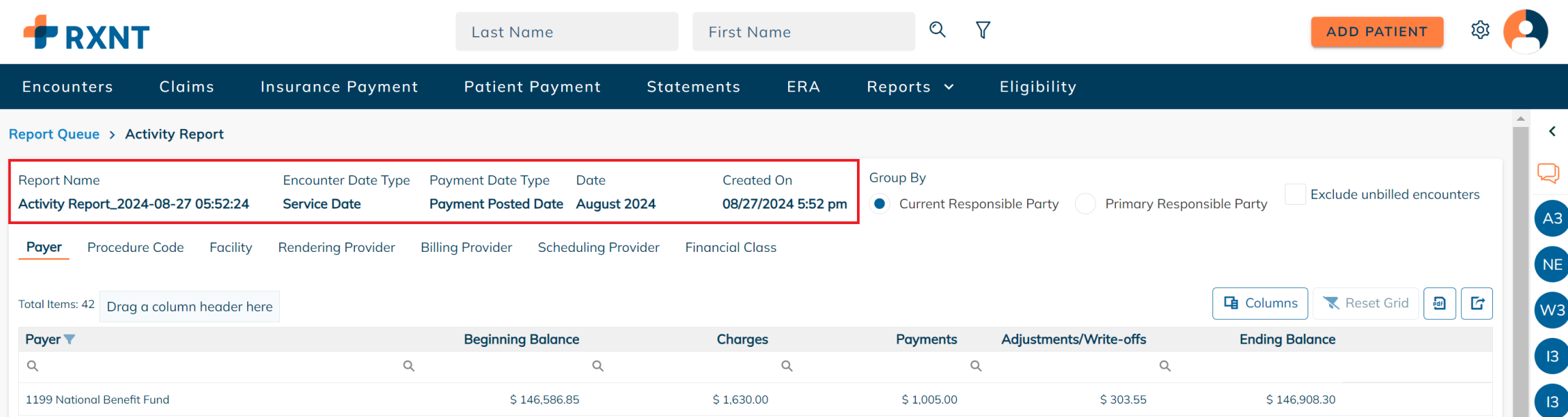 RXNT's Activity Report provides a monthly snapshot that shows the beginning balance, the total charges, payments, adjustments, and write-offs, and the ending balance for the period selected.