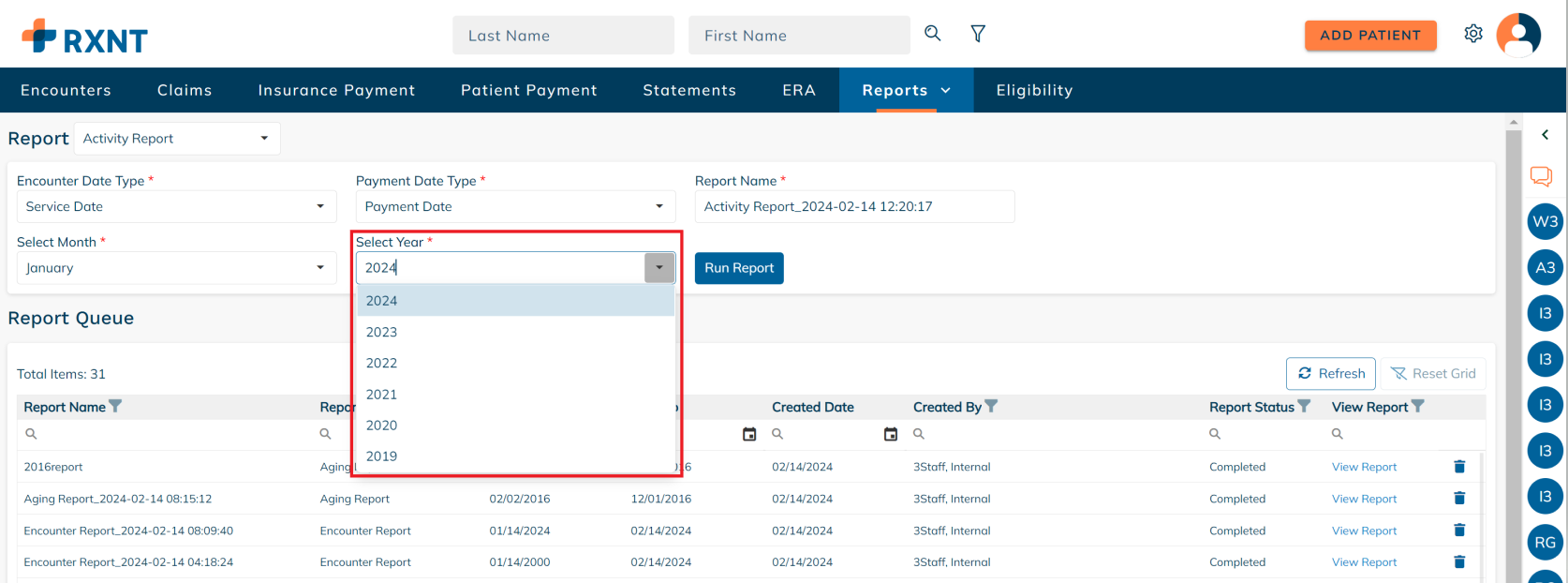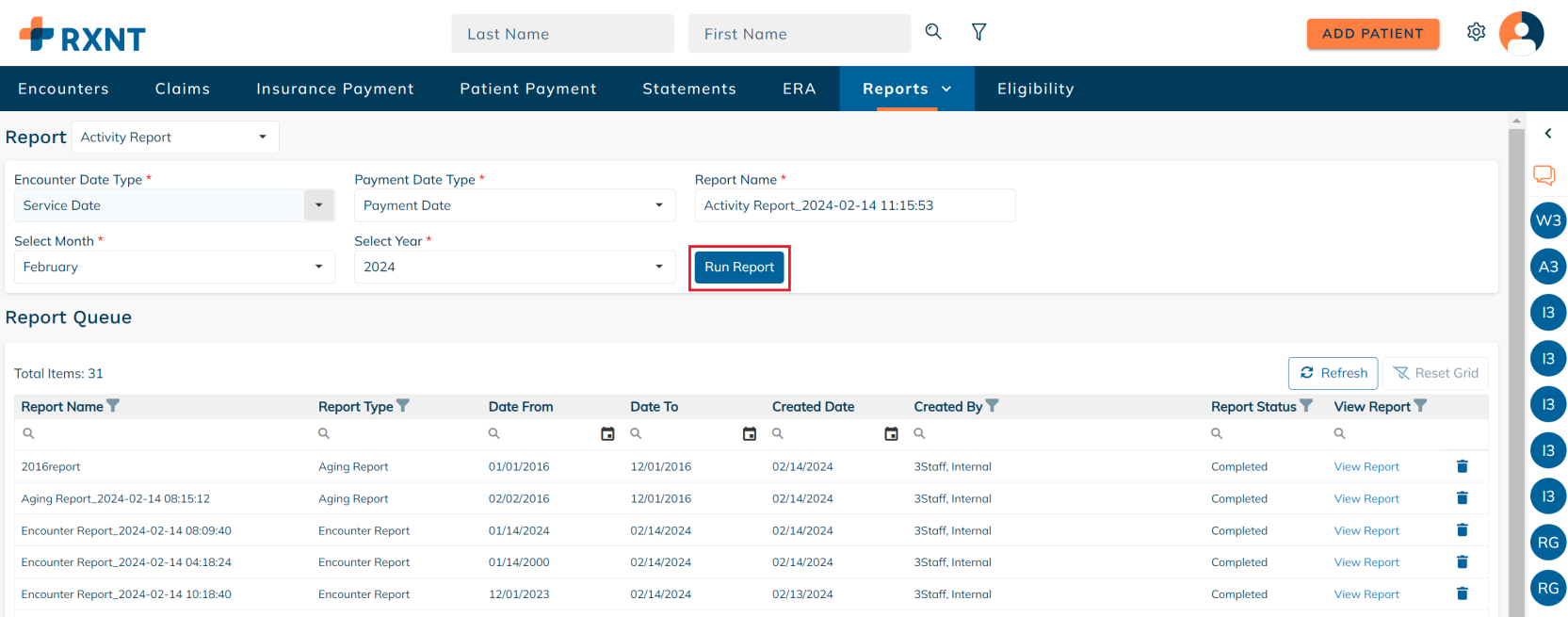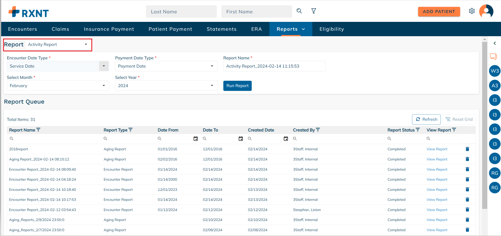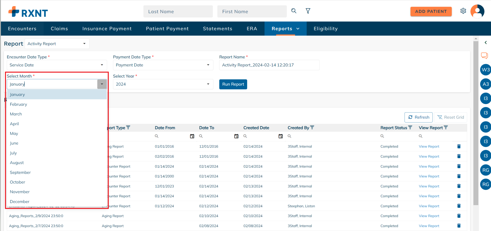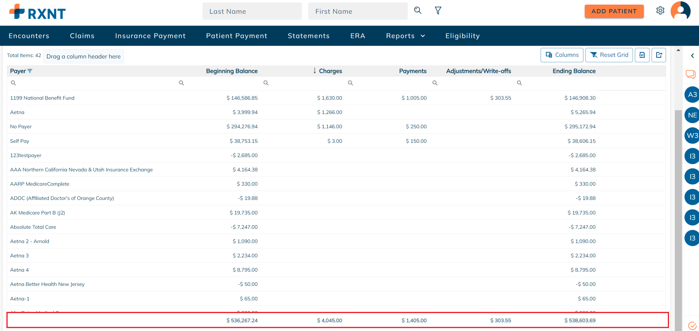 RXNT's Activity Report provides a monthly snapshot that shows the beginning balance, the total charges, payments, adjustments, and write-offs, and the ending balance for the period selected.