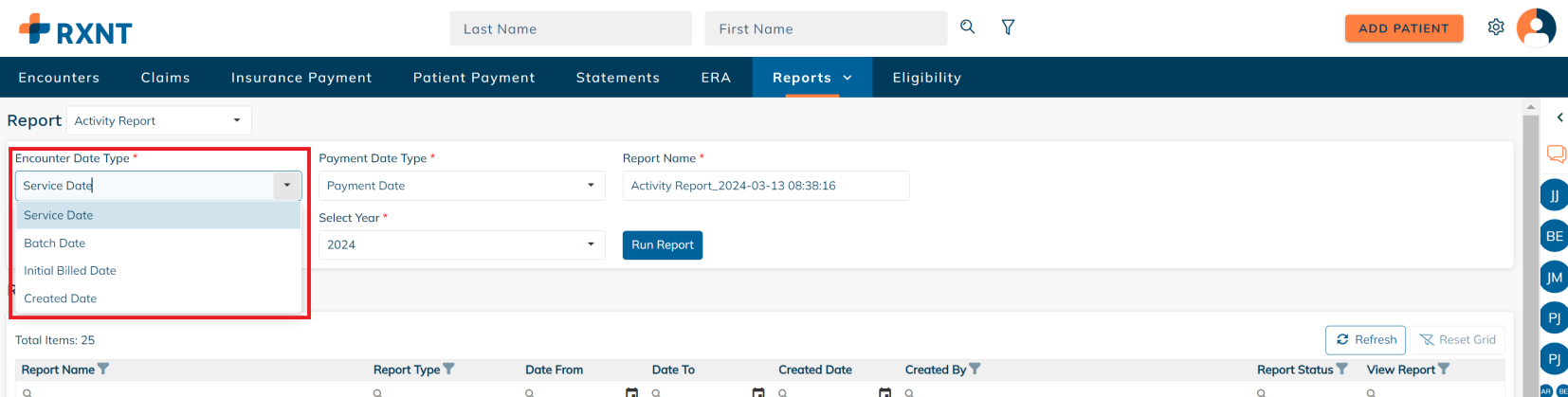 Select the Encounter Date Type. Based on the encounter date type selected, your report will change. For example, if you select "Service Date", your activity report will show all charges with a service date within the selected time frame.