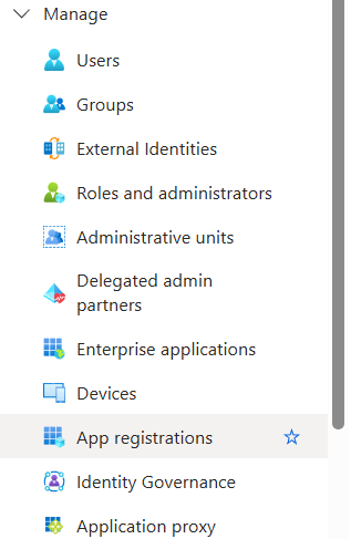 In the Microsoft Entra ID screen, click Manage in the left menu, then click App registrations.
