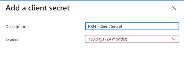 Enter RXNT Client Secret into the Description field, then select an expiration date from the Expires dropdown menu.