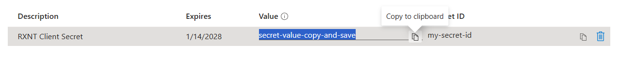 After the OAuth client is created, the page will display your new client credentials. Make sure to copy and safely save the Client Secret (in the Value column), as you'll need to enter it into RXNT in the next step. Azure will not display the value to you again.
