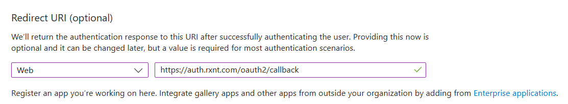 In the Redirect URI (optional) field, select Web as platform and enter https://auth.rxnt.com/oauth2/callback in the URL field.