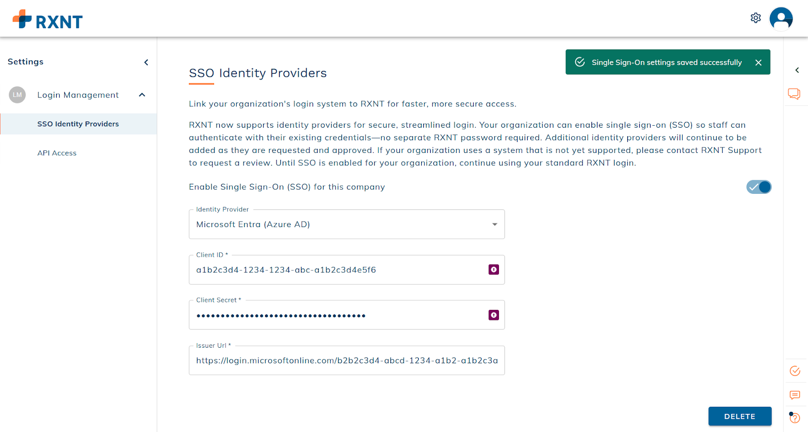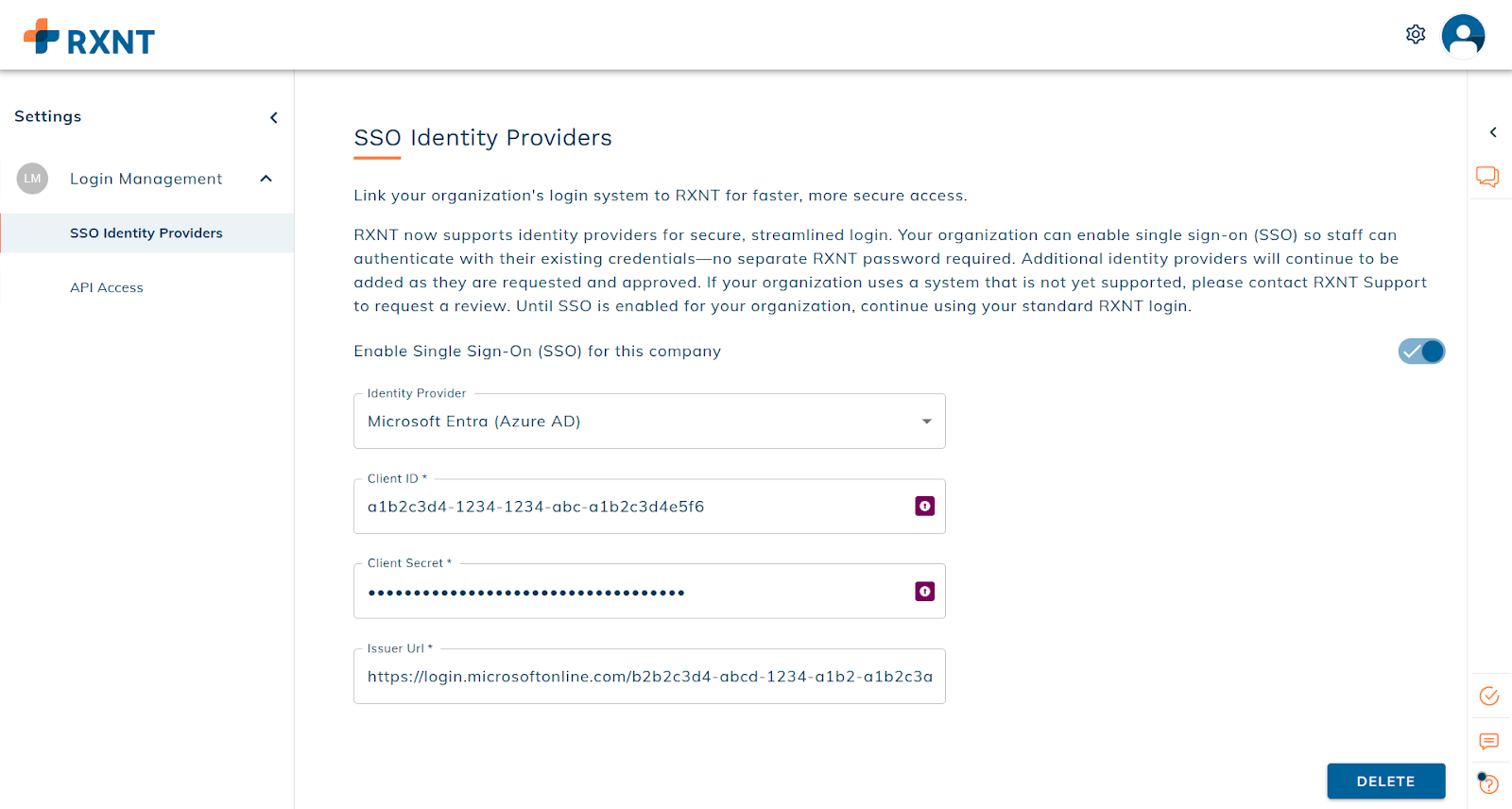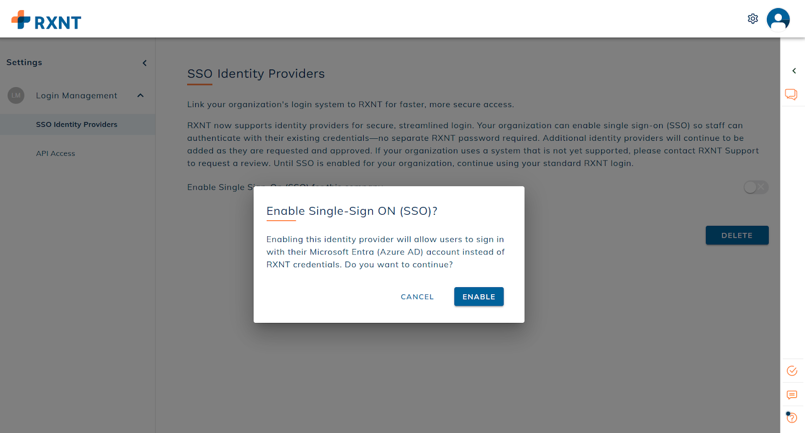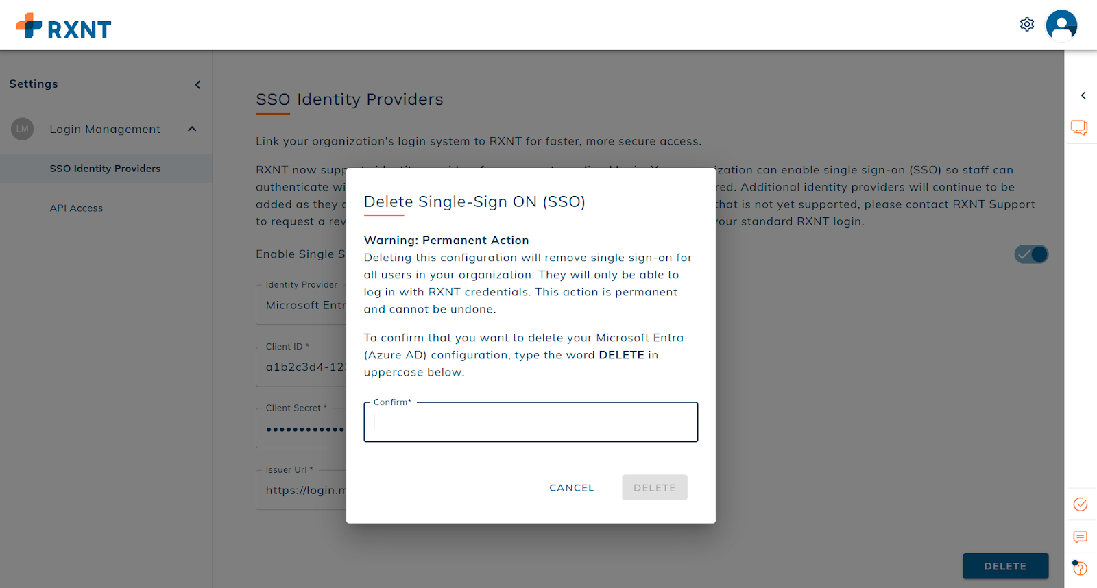 Deleting the Microsoft Entra (Azure AD) identity provider permanently removes your SSO configuration and stored credentials. The users in your organization will need to log in with RXNT credentials. This action cannot be undone. If you later want to use Microsoft Entra (Azure AD) for SSO again, you’ll need to re-enter your credentials and complete the setup process from the beginning.