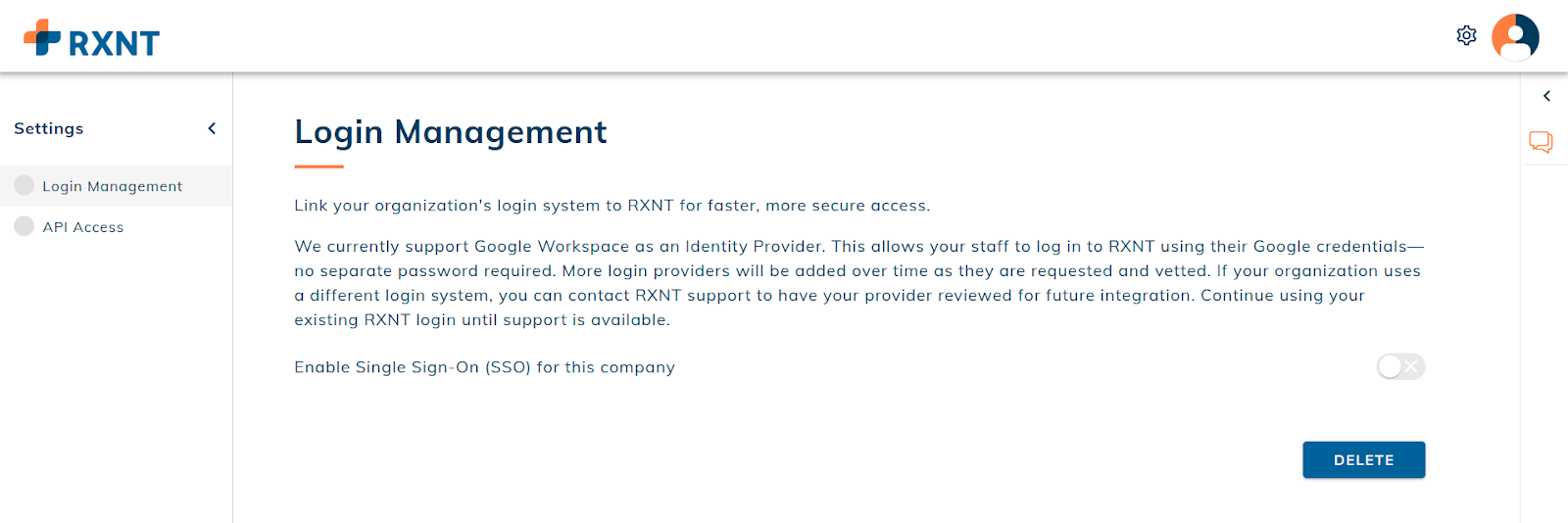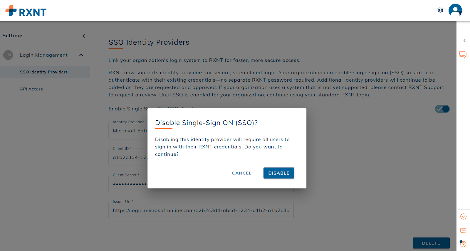 Once disabled, users must sign in using their RXNT credentials until SSO is re-enabled.