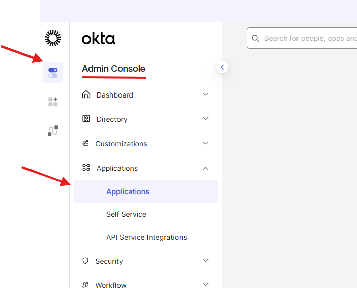 Log in to Okta and navigate to the Admin Console. Navigate to Applications, then select Applications.