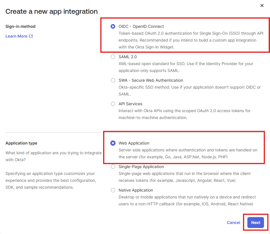 Select OIDC - OpenID Connect as the Sign-in method and Web Application as the Application type, then click Next.