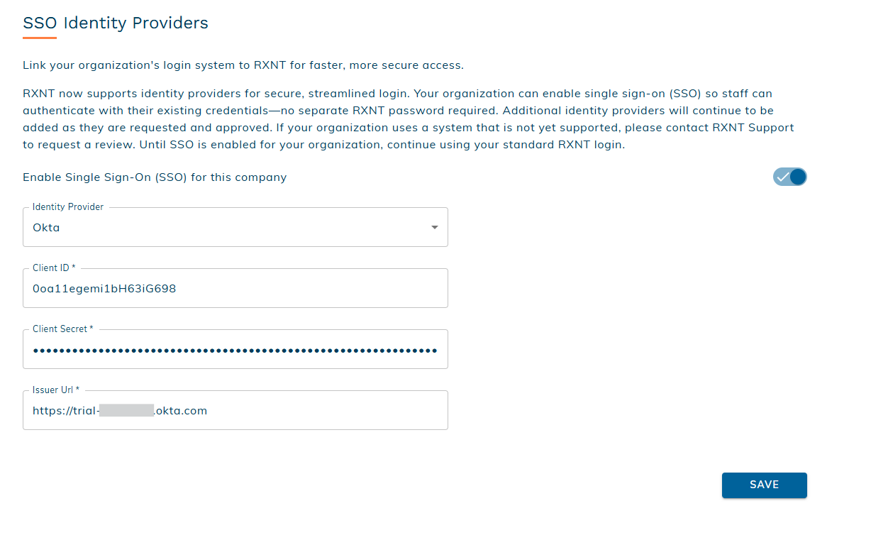 Set up Okta as your Single Sign-On (SSO) identity provider to let users log in to RXNT with their Okta credentials. This integration simplifies account management and enhances security by centralizing authentication through your organization’s Okta domain. This article walks you through the steps to configure Okta as your SSO identity provider in RXNT, including how to generate the necessary credentials and complete the setup.