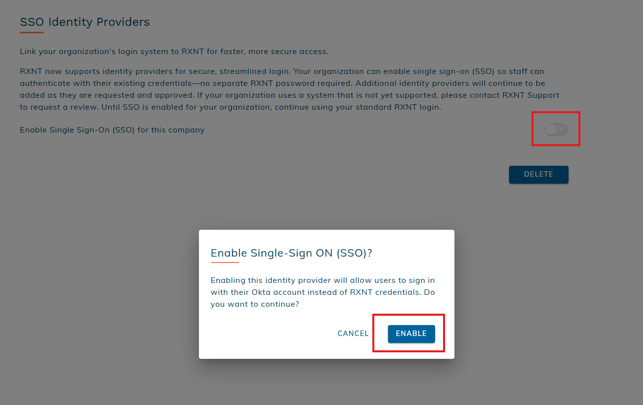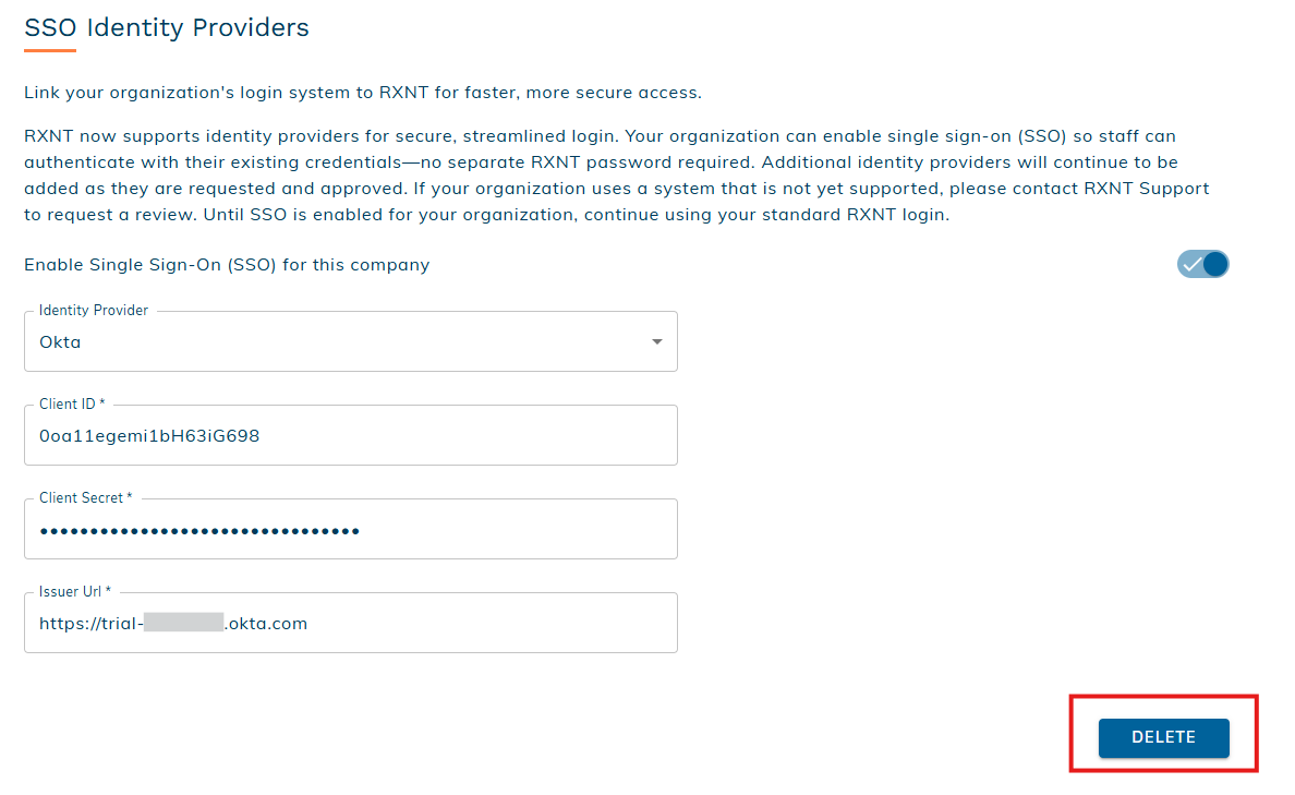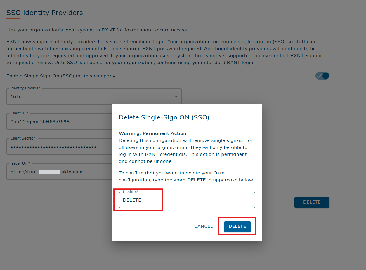 Deleting the Okta identity provider permanently removes your SSO configuration and stored credentials. The users in your organization will need to log in with RXNT credentials. This action cannot be undone. If you later want to use Okta for SSO again, you’ll need to re-enter your credentials and complete the setup process from the beginning.