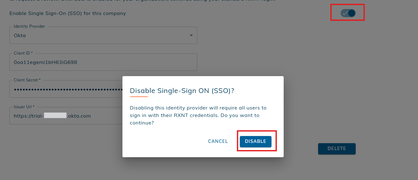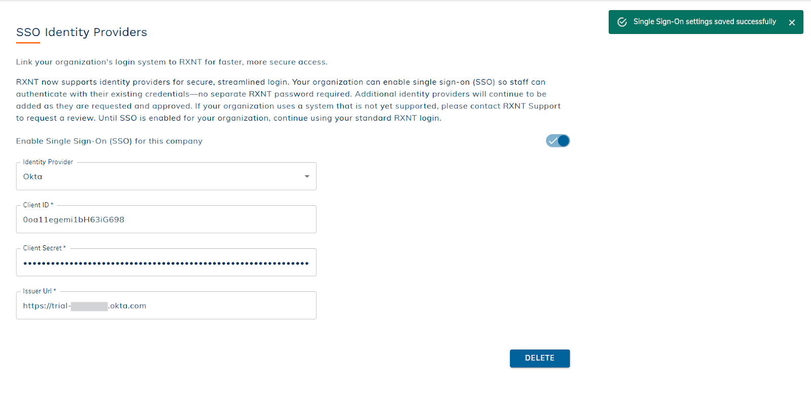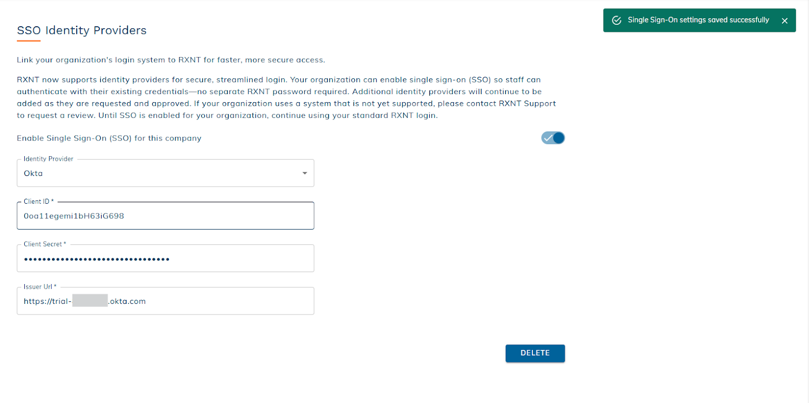 Deleting the Okta identity provider permanently removes your SSO configuration and stored credentials. The users in your organization will need to log in with RXNT credentials. This action cannot be undone. If you later want to use Okta for SSO again, you’ll need to re-enter your credentials and complete the setup process from the beginning.
